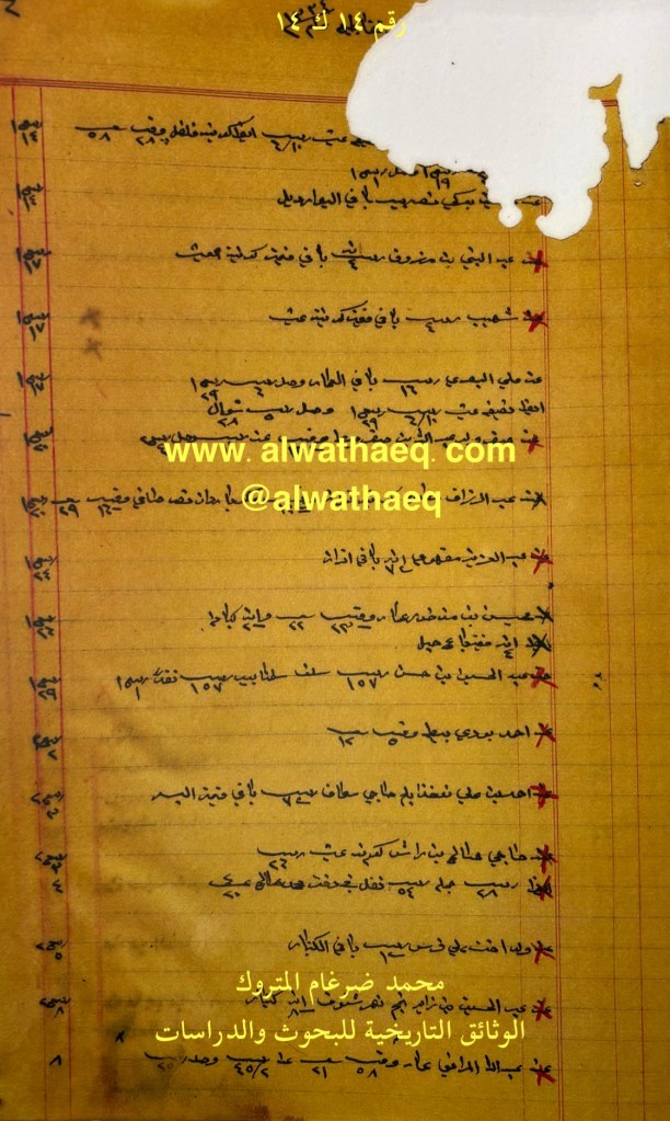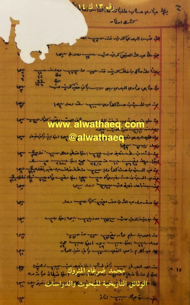 كشف حساب سنة ١٣٣٤هـ – ١٩١٥م من دفاتر التاجر محمد بن عبدالله المتروك الاسماء التي ذكرت🚩: خميس / خالد بن نصرالله / اسد / يوسف مصيبيح / محمد صالح / علي فرس / بن محري / حسين ولد ابراهيم / محمد ولد حسين ( نوخذه ) الشيوخ / راشد بن سلامه / اسماعيل الاصمخ / خميس بن يسر ( ياسر ) / سلطان استحمد / احمد اليماني / الحمالي / عبدالنبي ملا هادي من البضائع والمعاملات التي ذكرت 🚩: عيش / قند ( كونيه ) / عيش ( كونيه ) / عيش ( نصيفه ) / عيش ( نصيفيه ) / بيطه / تبابه / حماله / گبانه / چاه / صابون ( وقيه ) / فلفل ( كونيه ) / بشت / فلفل ( كيس ) / كفيه العملات المتداولة🚩: ربيه / آنه مضمون الرسالة🚩: معاملات تجارية في المواد الغذائية والاستهلاكية وثيقة رقم ( ١٢ ك ١٤ )🚩: . ✏️شرح وتعليق / محمد ضرغام المتروك . الوثائق التاريخية للبحوث والدراسات