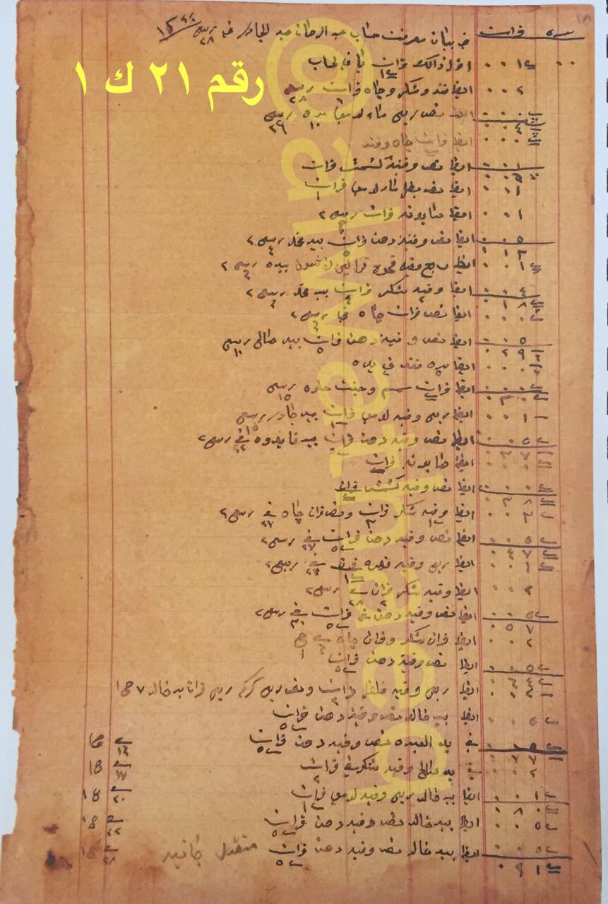 ١٢ قران باقي الحساب / قند / شكر / چاه / نص ربع ماء لومي / نص وقية كشمش / نص بطل ماء لومي / صابون / نص وقية دهن / ربع وقية قهوة / وقية شكر / نص قران چاه / سمسم / جنت حلوه / ربع وقية لومي / نص وقية كشمش / ربع وقية قهوة / ربع وقية فلفل / نص ربع كركم