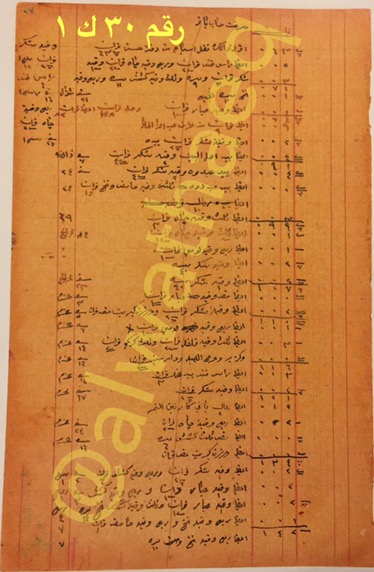 نقل سياهه / راس قند / ربع وقية چاه / شكر / ثلث وقية كشمش / نخج / وقية صبار / ثلثين وقية حامض ونخج / ربع وقية لومي / درزن كبريت / ثلث وقية كركم / ثلث وقية فلفل / كزبر / عرج الهيل / باقي كراتين التمر / نص ثلث كشمش