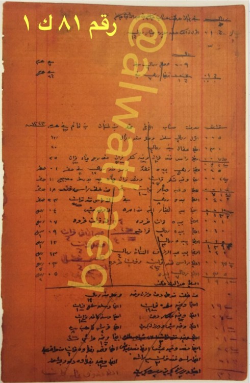 ٢ موره صبار / ٢ ريال سلف / عقال / راس قند / ١٢ وقية شكر / چاه / قوطي دهن وزن وقية / وقية عيش / درزن كبريت / دستة شمع / وقية طرشي / وقية بقلاوة / دستة كاغد