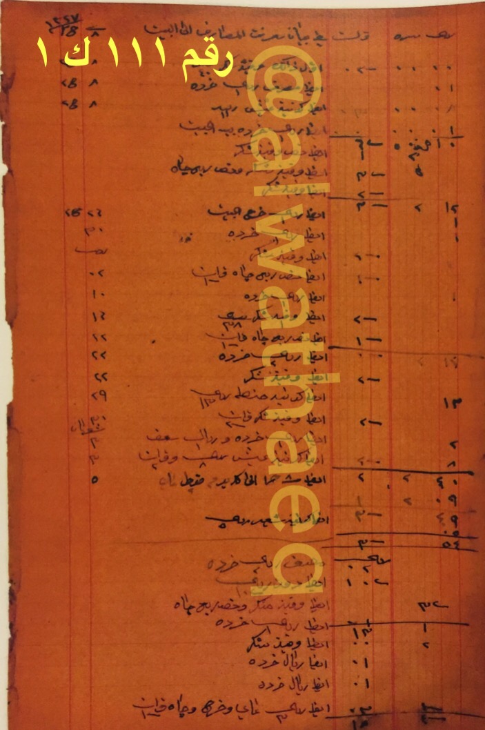 معرفة المصاريف الى البيت / شكر / خرده / عيش / چاه / حنطه / سعف / قوطي ماي / شعير / مصرف / دهن / ماي وخرج وچاه