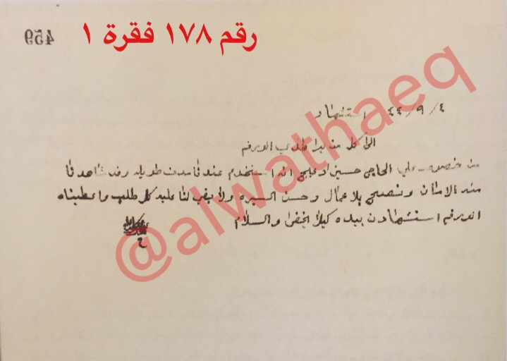 استشهاد الى كل من يرا هذه الورقة من خصوص علي الحاج حسين الدعيج انه استخدم عندنا (اي عَمل عند الحاج محمد المتروك) مدة طويلة و قد شاهدنا منه الامان و نصح بالاعمال وحسن السيرة ولا بقي لنا عليه كل طلب واعطيناه الورقة استشهادن بيده كيلا يخفى (لكي لا يخفى) والسلام.انتهى.