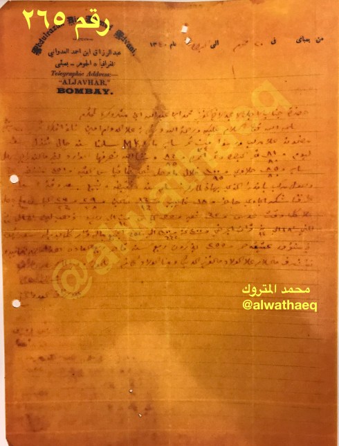 معاملات تجارية في المواد الغذائية و التمور ، ومنها الحاج عبدالرزاق العدواني يخبر الحاج محمد المتروك انه استلم التمور المرسلة منه من البصرة