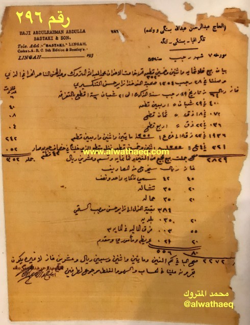 معاملات تجارية في التمور ، الحاج محمد المتروك وعبدالمحسن الخرافي يرسلون للحاج عبدالرحمن بستكي في لنجة ٣٥٢ تمر بصحبة النوخذة زاير حسن التنكسير وقد وصلت البضاعة للحاج عبدالرحمن في لنجة بتاريخ ١٣٥٤ / رجب / ٢٨ وقد باعها على فترات حتى تم البيع بالكامل لحساب محمد المتروك والخرافي في تاريخ١٣٥٥ / رجب / ٧
