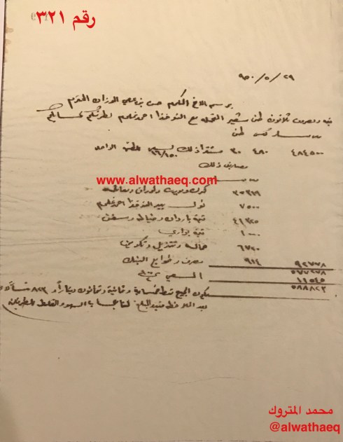 ٣٠ طن شعير / كمرك / نول / قيمة باردان وخياطة وسفن / قيمة بواري / حماله وتكوين وتنزيل / مصرف وطوابع البنك / السعي / مجموع المبلغ ٥٨٨ دينار و ٨٢٣ فلس