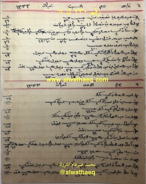 نصيفيه عيش / ٣٦ قران باقي الربيات / كيس مصري / كيس چاوي / كيس بوهندر / دريه غزل / كيس شكر / سلمنا احمد مدوه ١٠٠ ربيه / ١ ريال عربول ( عربون ) / عند عبدالله الفرج بيد دخيل العصيمي ١٤ كيس قهوة / شكر هندر / ٦٧ ريال باقي قيمة ٢ كيس شكر / كيس شكر مصري / شكر چاوي