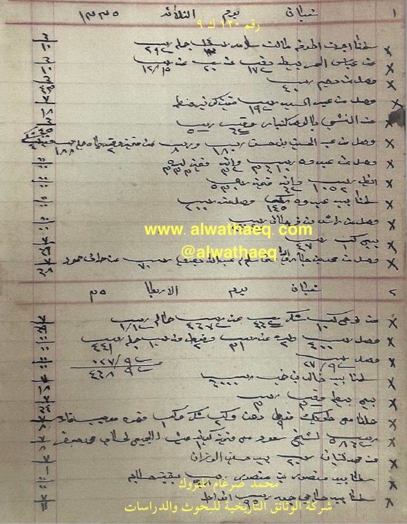 اجره الطوفه مالت سلامه / بيطه / حنطه / بالوص كنبار / چاه / وصل من عبدوه ٣٦١٠ ربيه و ٣.٢ انه قيمة ٣٣٣ ليره ايظا ١٠٥٢ ربيه و ٦.٢ انه قيمة ٥٣٠ ريال / سلمنا بيد عبدوه ١٤٥ كني / شكر / سلمنا بيد خالد بن خميس ٦٠٠٠ ربيه / دهن / ٥٨٦.٢ ربيه لشيخ سعود الصباح مع قيمة ١٠ كونيه عيش / ٩٥ ربيه انواط