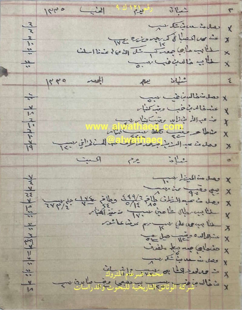 ١٢ كوجه وزره / كيس شكر / وقيه كنبار / وصل من عبدالرزاق ٨٥ طاقه و ٢٤ طاقه / قيمة الكنبار / عند الوالده ١١.٢ وقيه هيل / حق حاجي جمعه ٥ بيطه ملفوف / عند محمد الحمود الشايع ١٧٧ ربيه و ٥ انه سلف / صابون