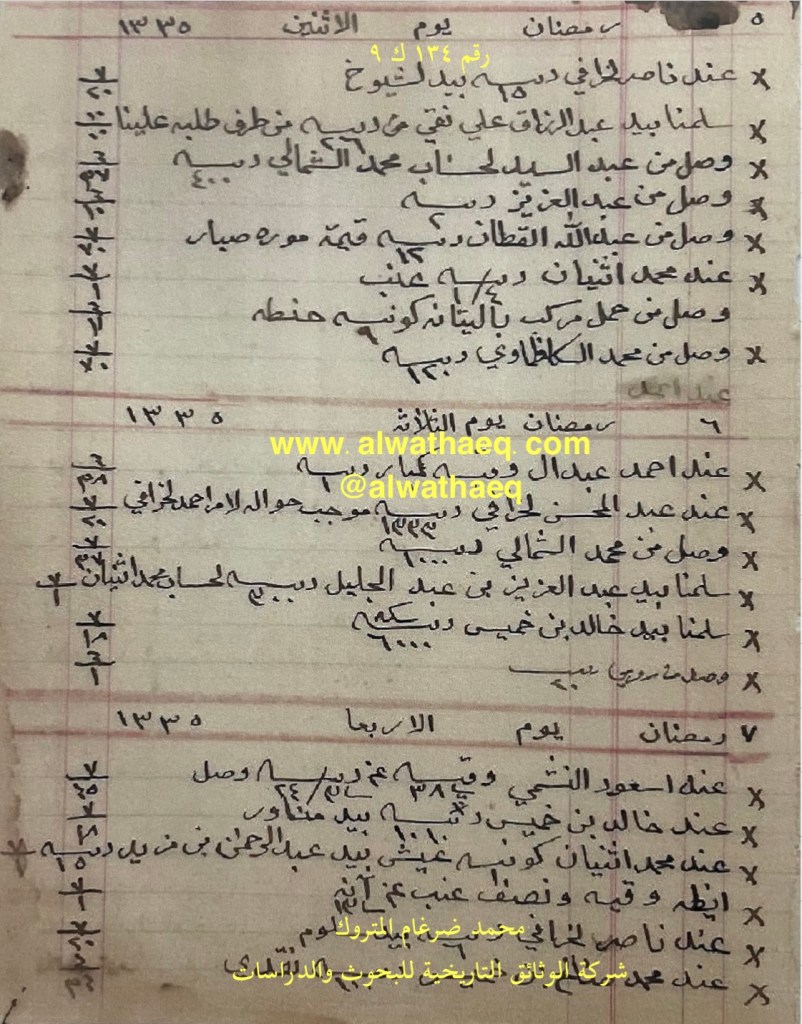 عند ناصر الخرافي ١٥ ربيه بيد الشيوخ / صبار / عنب / وصل حمل مركب باليتانه ٩ كونيه حنطه / كمبار / عند عبدالمحسن الخرافي ١٣٣٣ ربيه موجب حواله لامر احمد الخرافي / وصل من محمد الشمالي ١٠٠٠ ربيه / سلمنا بيد عبدالعزيز بن عبدالجليل ٣٠٠ ربيه لحساب محمد ثنيان / سلمنا بيد خالد بن خميس ٦٠٠٠ ربيه سكه / عند خالد بن خميس ١٠١٠ ربيه بيد مناور / ١٠ كونيه عيش