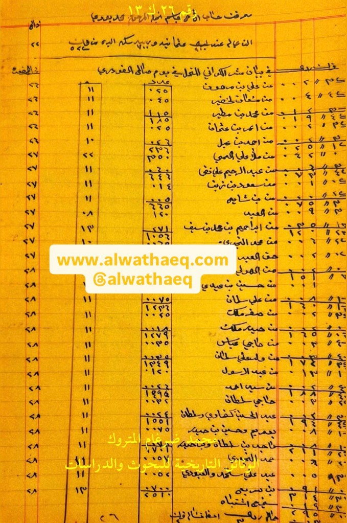 كشف حساب سنة ١٣٢٨هـ – ١٩١٠م من دفاتر التاجر محمد بن عبدالله المتروك الاسماء التي ذكرت🚩: حاجي منصور بن خميس الخشتي / عبدالرحمن بن حسين العسعوسي / محمد ثنيان / سليمان الذكير / سليمان العبداللطيف الابراهيم