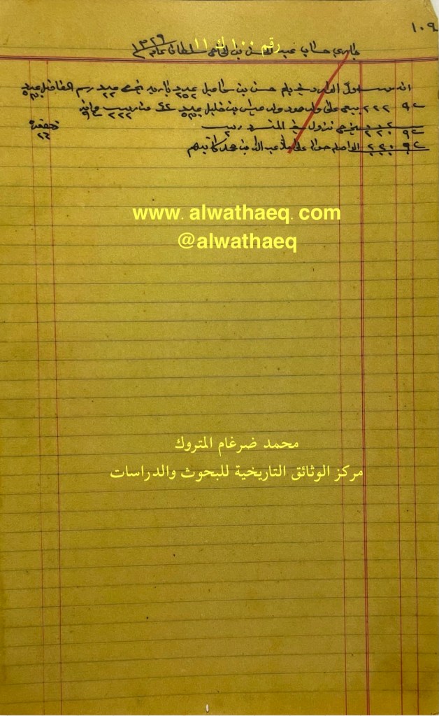رسالة بتاريخ ٢٧ رجب ١٣٥٤هـ ٢٤ اكتوبر ١٩٣٥م من شركة محمد المتروك وعبدالمحسن الخرافي (توقيع) محمد المتروك الى عبدالمحسن الناصر الخرافي ( الكويت ) الاسماء التي ذكرت🚩: حاجي علي / سيد علي / البصري / بن ادريس / مجيد / راعي الجبيل / خالد العبداللطيف / خالد الخميس الاماكن التي ذكرت🚩: الكويت / الجبيل / الكمرك ( الجمرك ) من المعاملات والبضائع التي ذكرت 🚩: حوالة / تمن السفن التي ذكرت🚩: الخشبه العملات المتداولة🚩: ربيه مضمون الرسالة🚩: معاملات تجارية في المواد العذائية وثيقة رقم( ٤٩١ فقرة ١ )🚩: . ✏️شرح وتعليق / محمد ضرغام المتروك . الوثائق التاريخية للبحوث والدراسات
