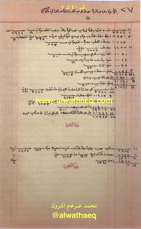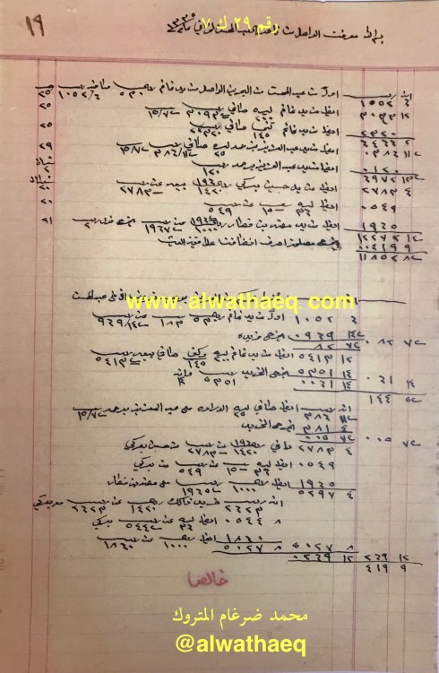 جاري حسابنا مع الا عبدالمحسن الناصر الخرافي لنا / سلمنا لحساب محمد الجارالله موجب نقل جنابه نمره ١٩ ، ٧٩٢٧ ربيه و انه / مصرف الحطب و صبار / بشت / تتن / سعف بيد عبدالمحسن ٧٦ ربيه و٣ انه / نقداً بيده ٥٠ ربيه / لكم عندنا الواصل من البحرين من نقود ١١٨٥٢ ربيه / مصلحة ٤١٩ ربيه ٩ انه / قيمة العيش الوارد من البحرين ٦٥٣٣ ربيه و ٣ انه / ٤٠٠ ربيه من يد حمد بو حمد يخرج طلبنا المذكور أعلاه المبلغ جرا له في حساب ابوه / موه صبار / وصل من الذكور ٧٠ ليره
