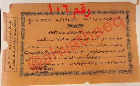 حوالات ، ويظهر في ترويسة الحواله مكتوب حاج احمد الشواف و أولاده – كويت – بحرين