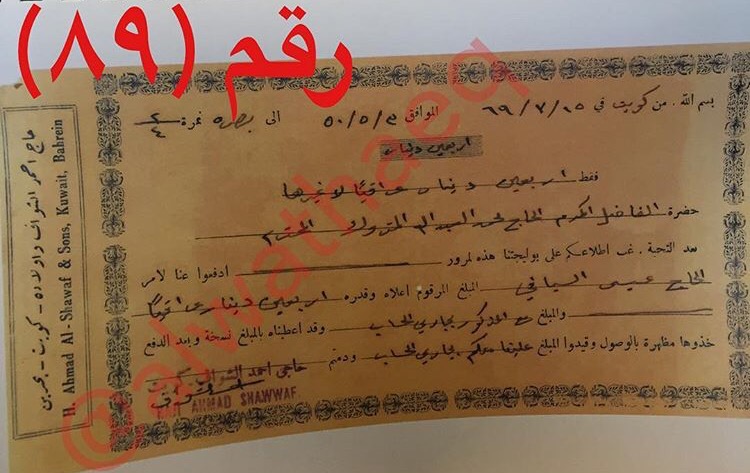 حوالات ، ويظهر في ترويسة الحواله مكتوب حاج احمد الشواف و أولاده – كويت – بحرين