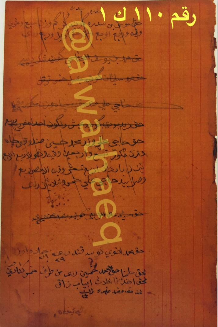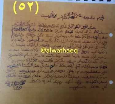 رسالة سنة ١٩٣٠ م من محبينكم محمد عبدالله المتروك وعبدالمحسن الخرافي (توقيع) محمد المتروك الى الحاج عبدالله المحمد الفارس ( الزبير ) الاسماء التي ذكرت🚩: خالد / الولد عبدالله ( المتروك ) الاماكن التي ذكرت🚩: الزبير / بومبي / البصرة / الناصرية مضمون الرسالة🚩: الحاج عبدالله الفارس يطلب من الحاج محمد المتروك ان يشحن له صندوق من بومبي ويرد علي الحاج محمد ( مطلوبكم الصندوق حلت البركة حالاً عرفنا بومبي يحملونه عن طريق البصرة ) وفي بداية الرسالة الحاج محمد مسرور بالخبر الذي بلغه به الحاج عبدالله الفارس ان خالد رزق ببنت ومن جملة ماقال ( بيدنا مشرفكم ١٠ الجاري وتلوناه مسرورين الخاطر .. تعريفكم ان ولد لخالد بنت حمدنا الله على سلامه ) ويختم في الرسالة ( ابلغ سلامنا الاولاد والعزيز لديكم ومنا الولد عبدالله ( المتروك ) في الناصرية . وثيقة رقم( ٤٧٣ )🚩: . ✏️شرح وتعليق / محمد ضرغام المتروك . الوثائق التاريخية للبحوث والدراسات