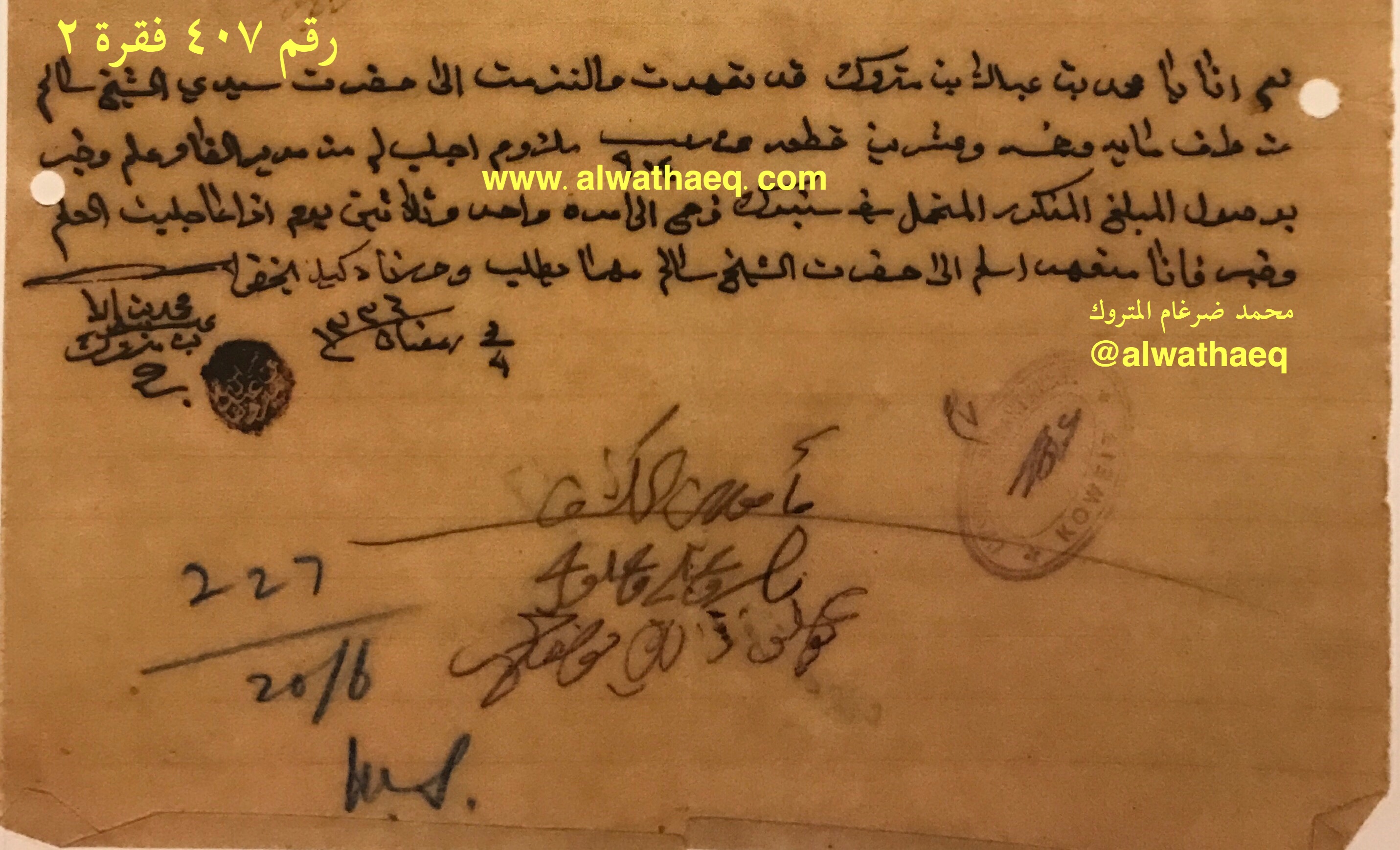 التاجر محمد المتروك يتعهد للشيخ سالم المبارك الصباح ( حاكم الكويت التاسع ) من طرف ١٢٥ قطعه عن ٩٤ ربيه ملزوم يجلب علم وخبر من مدير الفاو بمدة ٣١ يوم ويظهر في نهاية الوثيقة ختم وتوقيع الحاج محمد المتروك