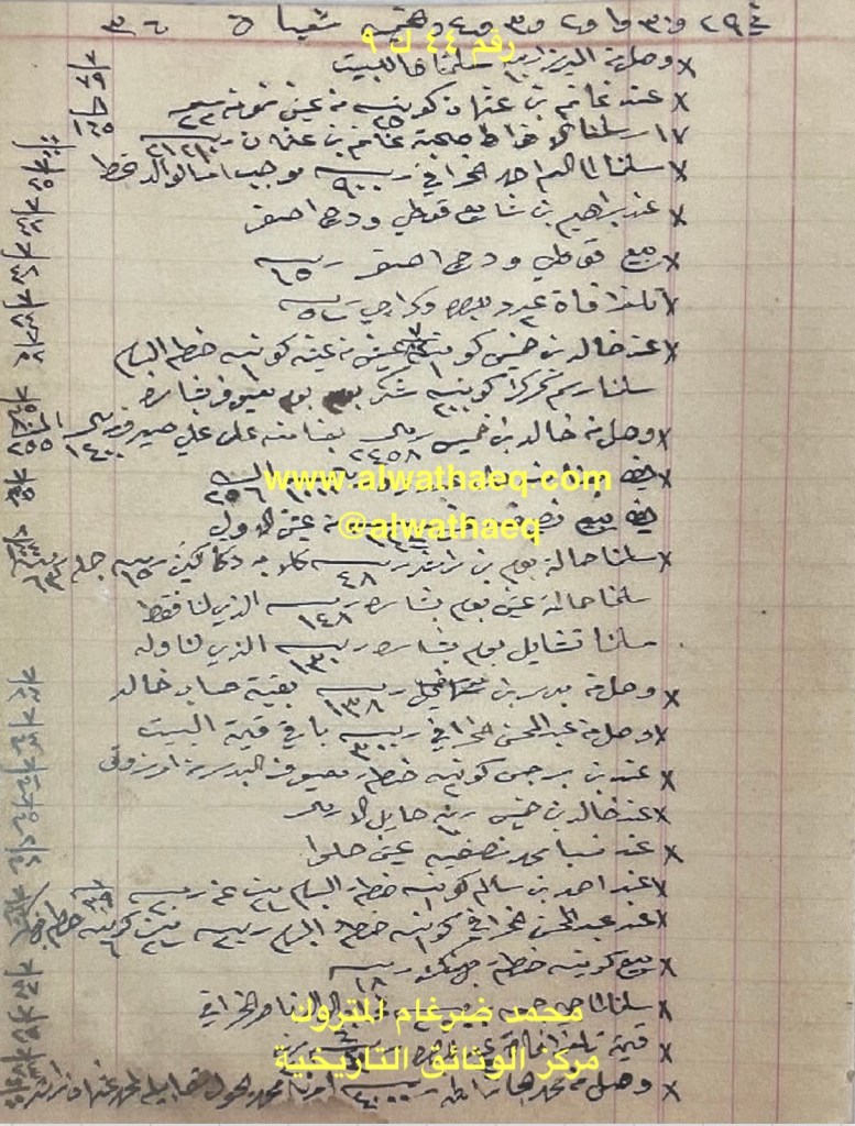 كشف حساب سنة ١٩١٨ م من دفاتر التاجر محمد بن عبدالله المتروك . الاسماء التي ذكرت🚩: الميرزا / غانم بن عثمان / العم احمد الخرافي / ابراهيم بن شايع / الوالد / خالد بن خميس / البسام / معيوف بشارة / علي صيرفي / عبدوه / بن راشد / بدر بن موسى / عبدالمحسن الخرافي / بن برجس / معيوف البدر / مرزوق / نسبا محمد / احمد بن سالم ( الخشتي ) / حجي جمعه / الوالد ناصر الخرافي / محمد الجارالله / محمد عثمان راشد . الاماكن التي ذكرت🚩: البيت / البصرة / كراتشي / الدكاكين من البضائع والمعاملات التي ذكرت🚩: ٢٥٠ كونيه عيش / سلمنا بيد العم احمد الخرافي ٩٠٠ ربيه موجب امر الوالد / قوطي ودج اصفر / تلغراف عدد٢ للبصره و كراتشي / رسم ٢٠٠ كونيه شكر / وصل من خالد بن خميس ٢٤٥٨ ريال / بيع ١٠٠٠ ريال / نصفيه عيش / تشايل بوم بشاره ١٤٨ ربيه الذي لنا وله / وصل من عبدالمحسن الخرافي ٣٠٠ ربيه باقي قيمة البيت / عيش حلوا / كونيه حنطه / سلمنا حجي جمعه ٢٥٠٠ ربيه لحساب الوالد ناصر الخرافي . السفن التي ذكرت🚩: النمونه / بوم معيوف بشاره / بوم بن راشد / بوم بشاره . العملات المتداولة🚩: ربيه / ريال / انه . ملاحظه🚩: كاتب الخط من أسرة الخرافي الكرام حيث ذكر عمه احمد الخرافي ووالده ناصر الخرافي وهو اخ عبدالمحسن الخرافي لكن لم يتبين لدي اسمه . وثيقة رقم ( ٤٤ ك ٩ )🚩: ✏️شرح وتعليق / محمد ضرغام المتروك رئيس مركز الوثائق التاريخية