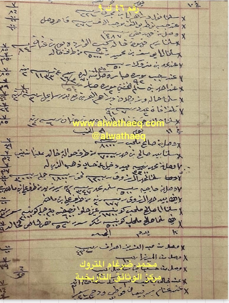 كشف حساب سنة ١٩١٨ م من دفاتر التاجر محمد بن عبدالله المتروك . الاسماء التي ذكرت🚩: بن مجرن / جمعه / فهد تقي / بن عثمان / يوسف بن محميد / محمد بن متروك / رجب / احمد بن سالم الخشتي / بدر اسماعيل / صالح محلب / صالح بن حمد ( الرومي )/ محمد المرزوق / حاجيه / علي بن مال الله / حمد المرزوق / عبدالعزيز الصراف / الميرزا / حسين بن اسماعيل / خالد بن خميس / غنام بربيعان ( الربيعان ) . الاماكن التي ذكرت🚩: البحرين / بومبي . من البضائع والمعاملات التي ذكرت🚩: نوط بو الف / رسم قهوه ٥٦ كيس الوارد في بوم بن عثمان / سلمنا اليو يوسف بن محميد ٥٠٠٠ ربيه من طرف خالد / ٩٢ موره صبار وصل من ٧٠ ليره / سلمنا حماله وزبلان دراهم البحرين / تلغراف عدد٢ ٧ ربيه و ٩ انه / وصل من صالح محلب ٨٠٠٠ ربيه سكه / سلمنا بيد صالح بن حمد ( الرومي ) ٧٠٠٠ ربيه ربيه حوالة خالد علينا من بومبي / واصل من محمد ٣٣٠٠ ربيه بيد دخيل عن حساب الذهب / ١٧٠٠ كونيه عيش حلوا ٦٠٠ نصيفه بلم جمله ٢٠٠٠ كونيه / ٥٠٠ كونيه شكر / ٣ قوطي ودچ . السفن التي ذكرت🚩: بوم بن عثمان . العملات المتداولة🚩: ربيه / انه / ليره . وثيقة رقم ( ٤٦ ك ٩ )🚩: . ✏️شرح وتعليق / محمد ضرغام المتروك رئيس مركز الوثائق التاريخية