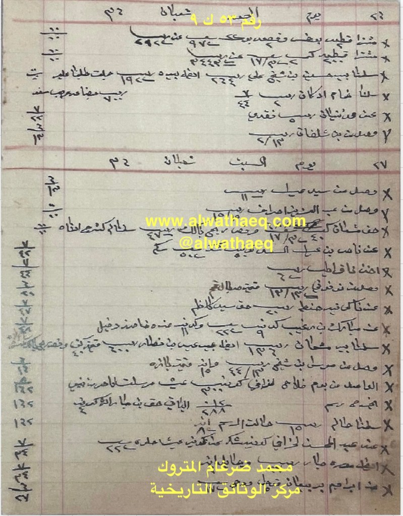 كشف حساب سنة ١٩١٨ م من دفاتر التاجر محمد بن عبدالله المتروك . الاسماء التي ذكرت🚩: حسين بن شيخ علي ( اليوسف ) / محمد ثنيان ( الغانم ) / بن شلفان / سيد عيسى / عبدالعزيز الصراف / مشعان / ناصر بن عيسى السعد / توفوني ( تيفوني ) / ناكو / سيد كاظم / مبارك بن رغيب / دخيل / عيسى بن نصار / موسى بن شيخ / فلاح الخرافي / ناصر ( الخرافي ) / بن جارالله / عبدالمحسن الخرافي / ابراهيم بربيعان ( الربيعان ) . الاماكن التي ذكرت🚩: بومبي / الدكان . من البضائع والمعاملات التي ذكرت🚩: ٢ قطعه بوخمس / ٢٠٠ قطعه / حمام الدكان ٢ ربيه / ٤٠ كيس / ٥٠ كونيه شكر / قراطيس / صربال قراطيس / كونيه حنطه / قيمة بازه / الواصل من بوم فلاح الخرافي ٣٠٠ كونيه عيش مرسلة ناصر من بومبي / كونيه عيش حلوه / موره صبار / حمايل / ٥ قوطي ودج . السفن التي ذكرت🚩: بوم فلاح الخرافي . العملات المتداولة🚩: ربيه / انه / ربيه سكه . وثيقة رقم ( ٥٣ ك ٩ )🚩: . ✏️شرح وتعليق / محمد ضرغام المتروك رئيس مركز الوثائق التاريخية