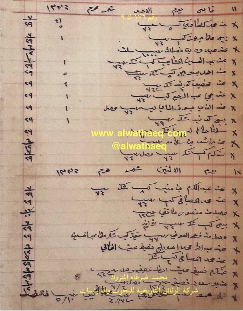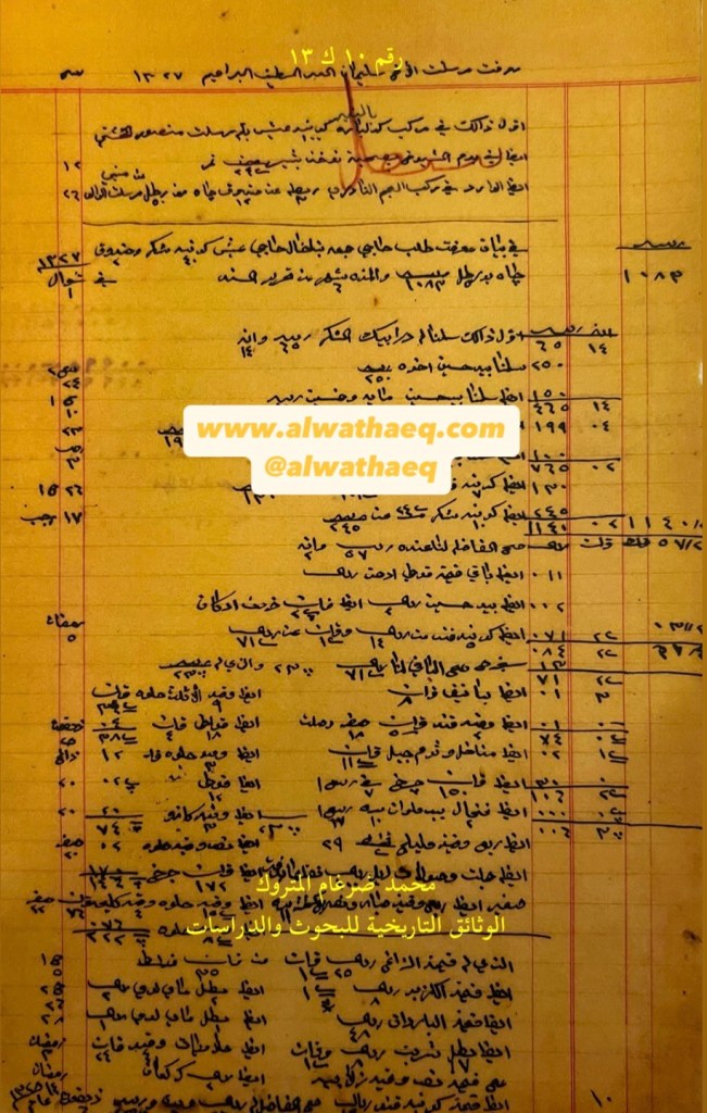 كشف حساب سنة ١٣٢٧هـ – ١٩٠٩م من دفاتر التاجر محمد بن عبدالله المتروك الاسماء التي ذكرت🚩: الاخ سليمان العبداللطيف الابراهيم / منصور الخشتي / نوخذه بشير / الوالد ( عبدالله محمد المتروك ١٨٣٦م – ١٩٠٩م ) / حاجي جمعه بن خال عيسى / حسين اخوه ( بن عيسى ) / علوان