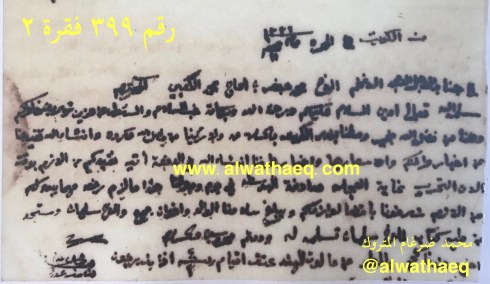 جاري حسابنا مع الاخ ناصر العبدالمحسن الخرافي له عندنا والذي لنا عنده / من يد عبدالمحسن من البحرين ١١٨٥٢ ربيه و ٨ انه و ٢ بيزه / من يد حمد بوحمد راعي البحرين ٤٠٠ ربيه / قيمة العيش الوارد من البحرين / صافي شكر المقبوض من داود المرزوق / صافي قهوة و ٤ موره صبار الوارد من بوم المرزوق / حنطه الوارد بجيكلا / صافي ١٤٨٨ كيس حنطه الوارد في بالينانه / ١٠٠٠ كيس رنكون ششتر / ٤٢٢ كيس بلم بارو / ٤١٢ كيس حنطه بارو / ٣٠١٢٩ ربيه ٧ انه ٢ بيزه طلبنا عليكم موجب جنابه نمره ١٩ عنها سلمنا لكم في كراتشي وسلم لكم خالد بن خميس / ٢ حواله على الفضل ٢٠٠٠٠ ربيه وبيد ناصر الساير ٨٥٠٠ ربيه / بيد جاسم بودي قيمة ٥٠٠ كيس عيش / مصلحتنا من عيش البحرين ٤٥٧٠ ربيه و ١٥ انه / مصلحتنا من عيش الوارد في المراكب المذكوره أعلاه ٣٠١٩ ربيه / بيد عبدالمحسن انواط ١٠٠٠ ربيه / فرق الكنيات و ليرات ٢٠٠ ربيه