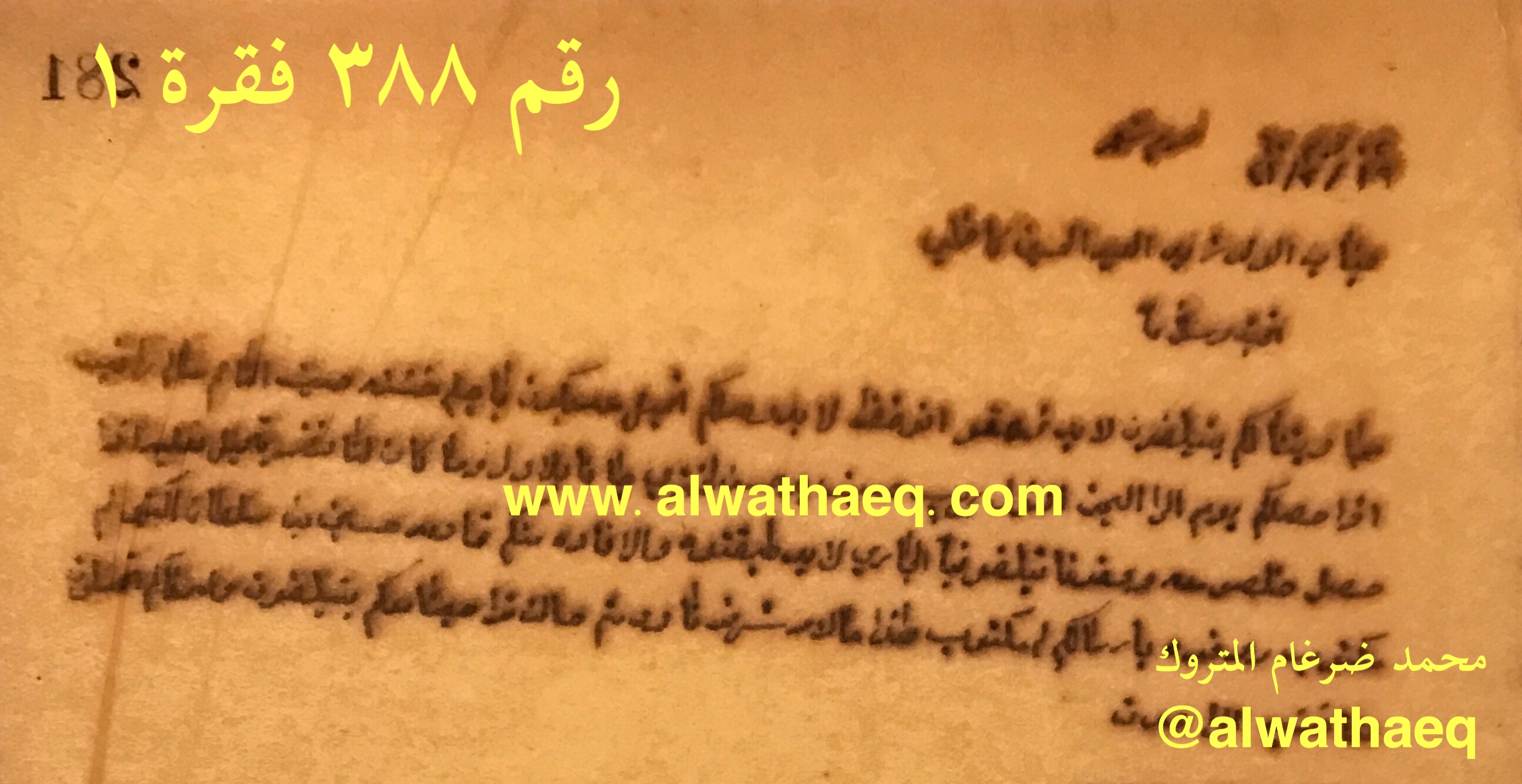 رسالة سنة ١٣٥٣هـ – ١٩٣٤م من محمد عبدالله المتروك وعبدالمحسن الخرافي ( توقيع ) محمد المتروك الى محمد وعبدالرحمن أبناء الحاج عبدالله الخليل ( البصره ) الاسماء التي ذكرت🚩: خالد الكليب / عبدالله / حاجي احمد المنصور من أهالي القطعه / عبدالله السليمان الذكير / صالح اليحيا