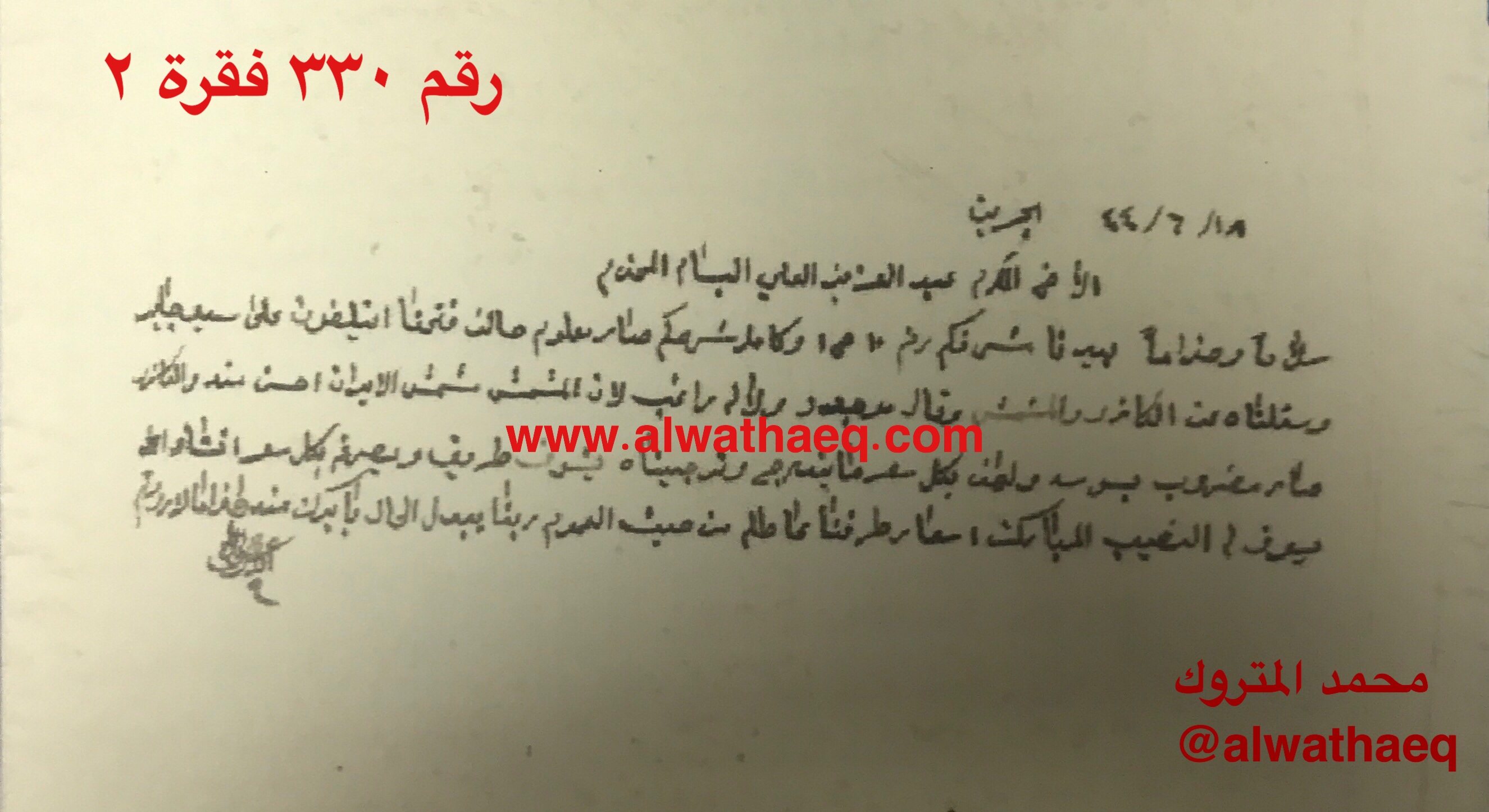 رسالة سنة ١٩٤٤ م من محمد بن عبدالله المتروك الى محمد العبدالله العريفي ( بغداد ) الاماكن التي ذكرت🚩: بغداد / خرم شهر / سوريا / ايران / الاسواق من المعاملات والبضائع التي ذكرت 🚩: چاه / بضائع حراير مضمون الرسالة🚩: معاملات تجارية في المواد الغذائية والاستهلاكية ومنها الحاج محمد المتروك يبلغ العريفي انه تم اسلام الچاه وجاري قبض باقي قيمته كذلك يبلغه ان له بضاعة متجه الى ايران فاذا له بضاعة متجه الى خرم شهر ( المحمره ) ياخذه شراكة معه وهو يسعى به في خرم شهر ثم يستقر منه ( الحراير ) وارده من سوريا ويطلب منه الافاده وثيقة رقم( ٤٧٩ فقرة ٣ )🚩: . ✏️شرح وتعليق / محمد ضرغام المتروك . الوثائق التاريخية للبحوث والدراسات