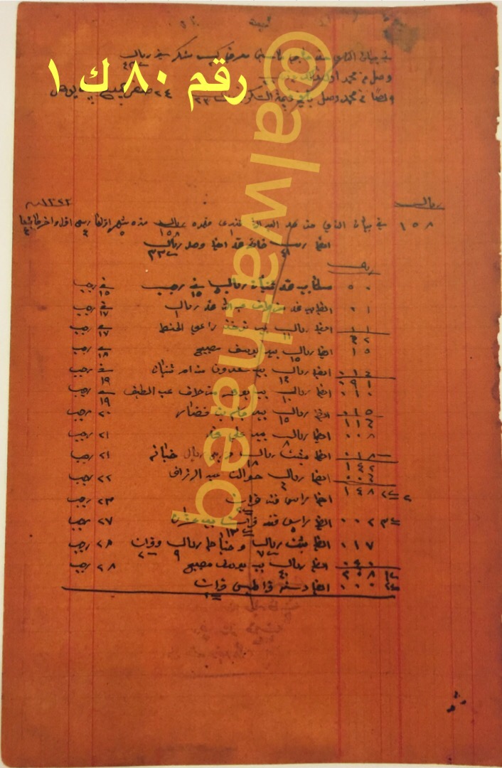 حواله / بشت / ٢٠٠٠ ربية سكة / خياط بشت وقيطانه / ١٠٠٠ ربيه سكة / ٦٠ ربيه لاجل الكاتب / ٢ فرده جلوه / حواله ١٠٠٠ ربيه / لوله زري / حواله ١٠٠٠ ربيه / بشت خاركي / خياط عباه / ٢ كيس قهوة / رسم ٢ ريال وحماله / نوط عن ١٠٠٠ ربيه / ماركة a / ١٣ مورة صبار / قوطي كاز (قاز)