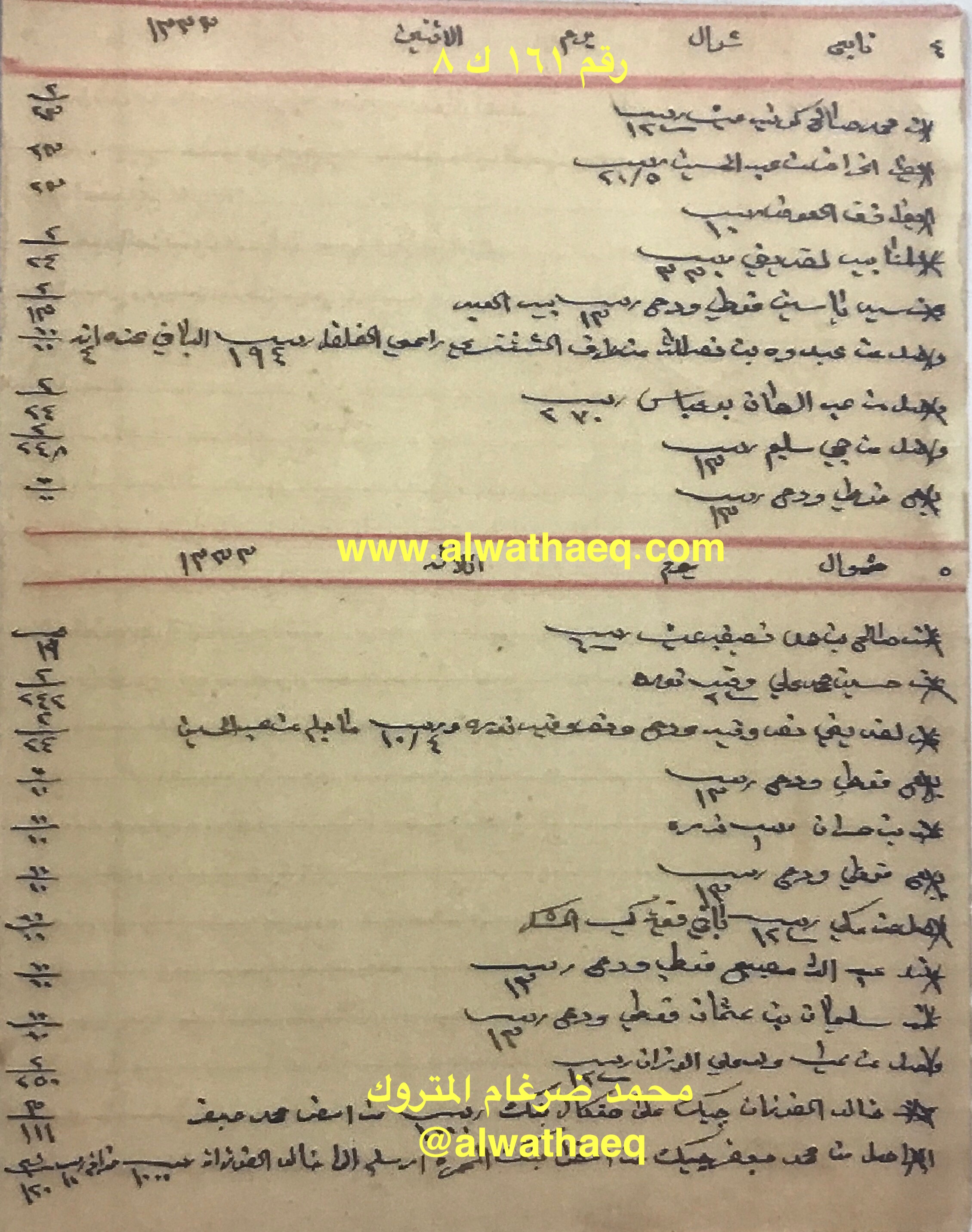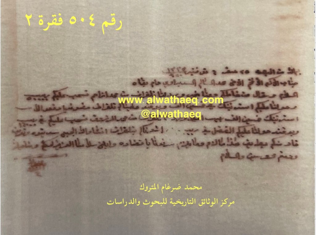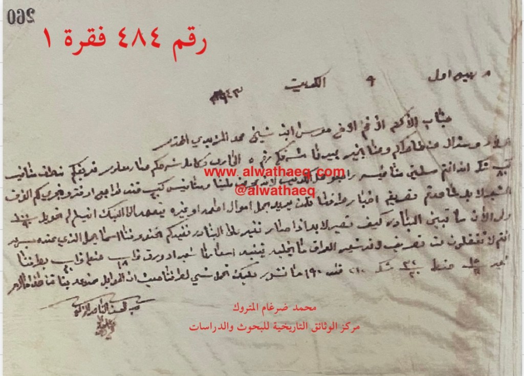 مضمون الرسالة🚩: معاملات تجارية في المواد الغذائيّة والاستهلاكية والتمور ومنها الحاج محمد المتروك يبلغ المزيدي بان يرسل ل عبدالمحسن الخرافي سديري وقيده على حساب محل الكويت كذلك يبلغه ان يبحث له عن طباخين اثنين بدل الطباخين الذين عنده كونهم مسافرين لإجازة وحدد رواتبهم بين ٥ إلى ١٠ ربيات كذلك المزيدي يعلم الحاج محمد المتروك بانه تم تأجير احد بيوته بقيمة ٥ ربيه بالشهر ( تعريفكم البيت اجرتوه الشهر ٥ ربيه مبارك ) وثيقة رقم( ٥١٧ فقرة ١ )🚩: . ✏️شرح وتعليق / محمد ضرغام المتروك . الوثائق التاريخية للبحوث والدراسات