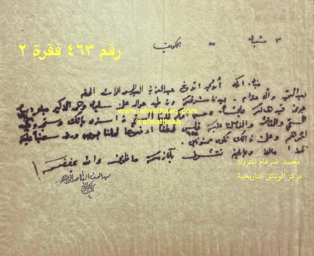 رسالة سنة ١٩٥٠ م من محمد عبدالله المتروك الى حضرة الفاضل البنك العثماني . الاسماء التي ذكرت🚩: فهد المرزوق / القبطان محمد / القبطان عبدالرحمن . الاماكن التي ذكرت🚩: كراتشي . البضائع والمعاملات التي ذكرت🚩: تصحيح اسم السفينة والقبطان في الحواله . السفن التي ذكرت🚩: فتح الكريم / الناصري . نص الرسالة🚩: حضرة الفاضل البنك العثماني المحترم بعد التحيه من خصوص الحوالة التي سحبناها على فهد المرزوق صار اسم السفينة واسم القبطان بالغلط ونرجو ان تدقوا الى معتمدكم بكراتشي يعتمد اسم السفينة فتح الكريم بدلاً من الناصري واسم القبطان محمد بدلاً من عبدالرحمن وعليه نشكركم. . وثيقة رقم( ٤٦٤ فقرة ٢ )🚩: . ✏️شرح وتعليق / محمد ضرغام المتروك رئيس مركز الوثائق التاريخية