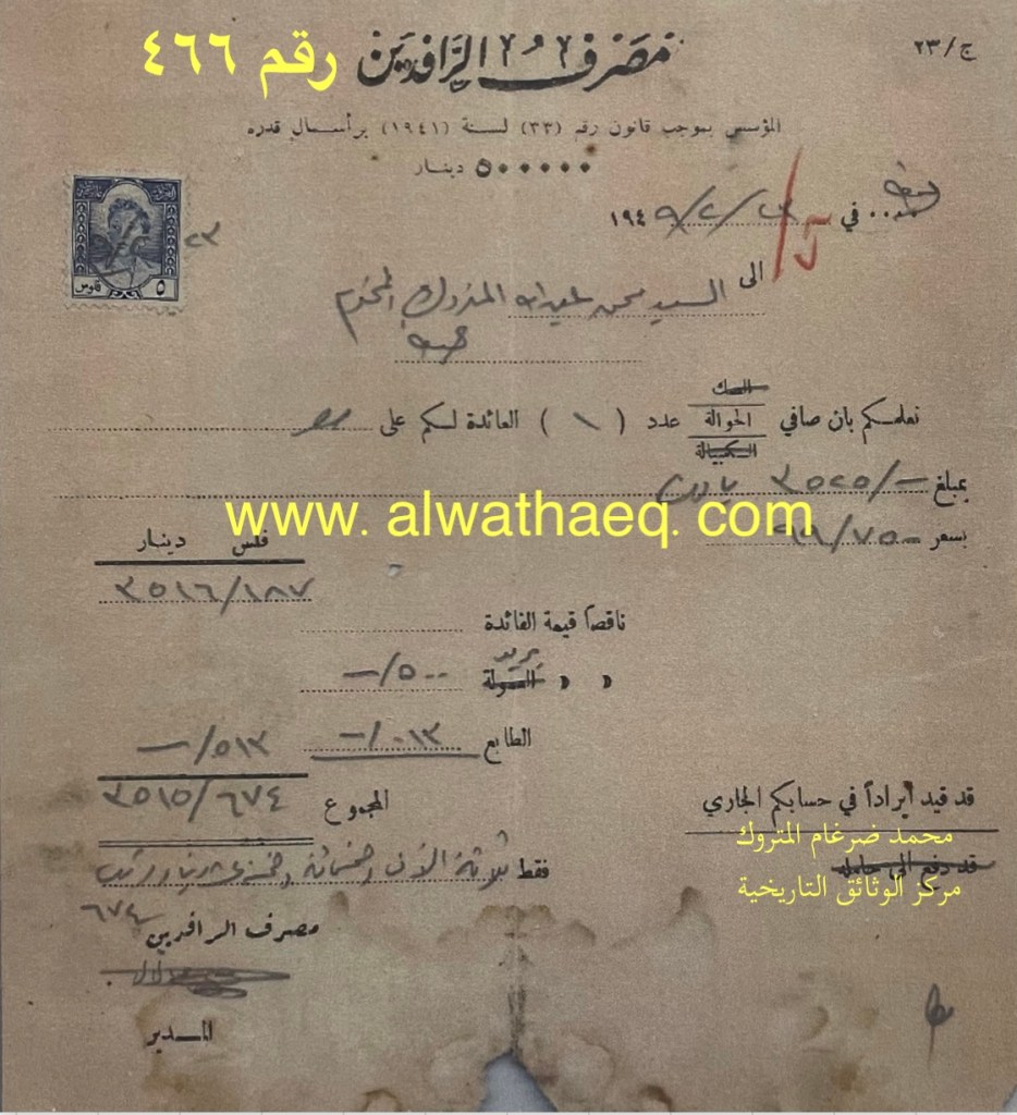 رسالة سنة ١٩٤٩م من مدير مصرف الرافدين الى السيد محمد عبدالله المتروك . البضائع والمعاملات التي ذكرت🚩: عدد ١ حواله بمبلغ ٣٥٢٥ باون بسعر ٩٩/٧٥٠ ٣٥١٦ دينار و ١٨٧ فلس ناقصاً قيمة : بريد ٥٠٠ فلس الطابع ١٣ فلس المجموع : ٣٥١٥ دينار و ٦٧٤ فلس . العملات المتداولة🚩: باون / دينار / فلس . ملاحظة🚩: مصرف الرافدين تأسس في العراق بموجب قانون رقم ٣٣ لسنة ١٩٤١م برأس مال قدره ٥٠٠،٠٠٠ دينار . وثيقة رقم( ٤٦٦ )🚩: ✏️شرح وتعليق / محمد ضرغام المتروك . مركز الوثائق التاريخية للبحوث والدراسات