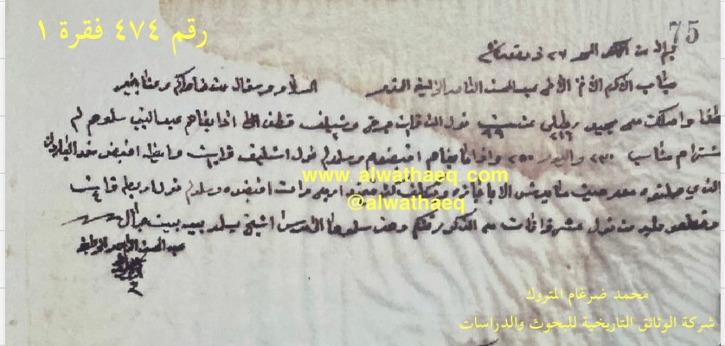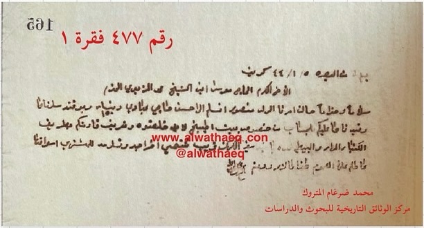 رسالة سنة ١٩٤٤ م من محمد بن عبدالله المتروك ( البصرة ) الى موسى ابن الشيخ محمد المزيدي ( الكويت ) الاسماء التي ذكرت🚩: الولد منصور ( المزيدي ) / حسن حاجي عبادي / الطبيخ الاماكن التي ذكرت🚩: بيت الطبيخ ( طبيخ بن فهد الطبيخ ) من المعاملات والبضائع التي ذكرت 🚩: كنبار / بيطه العملات المتداولة🚩: دينار مضمون الرسالة🚩: الحاج محمد المتروك يبلغ الحاج موسى المزيدي بانه امر الولد منصور ( المزيدي ) ابن الحاج موسى ان يسلم مبلغ ١٥٠دينار وكذلك يستفسر من المزيدي عن بيت الطبيخ ( لا بد خلصتوه ) وقد اشترى الحاج محمد المتروك ذلك البيت من طبيخ بن فهد الطبيخ ، ثم يخبره ان الكنبار و البيطه الى الان باقية في الجمرك قريب ننتهي من اخراجه ويسلمه للمشتري وثيقة رقم( ٤٧٧ فقرة ١ )🚩: . ✏️شرح وتعليق / محمد ضرغام المتروك . الوثائق التاريخية للبحوث والدراسات