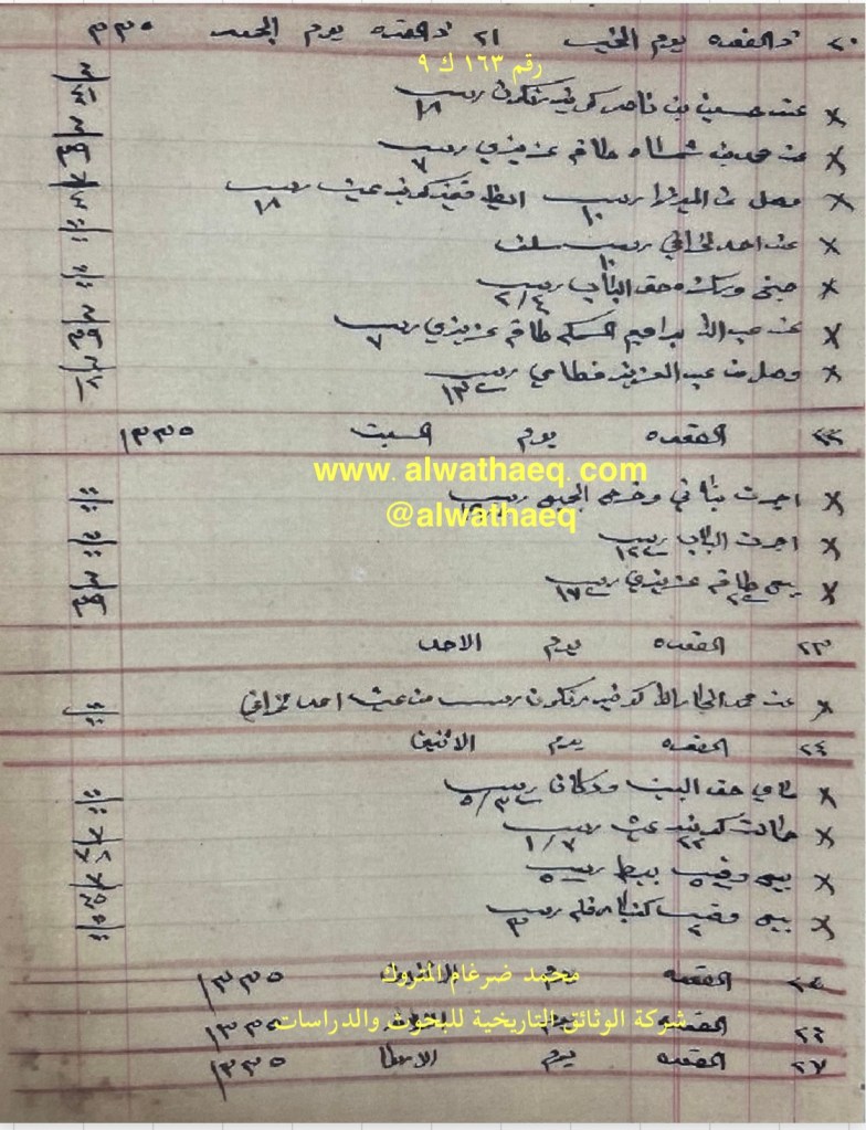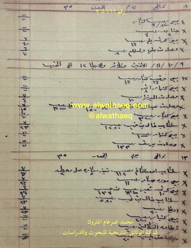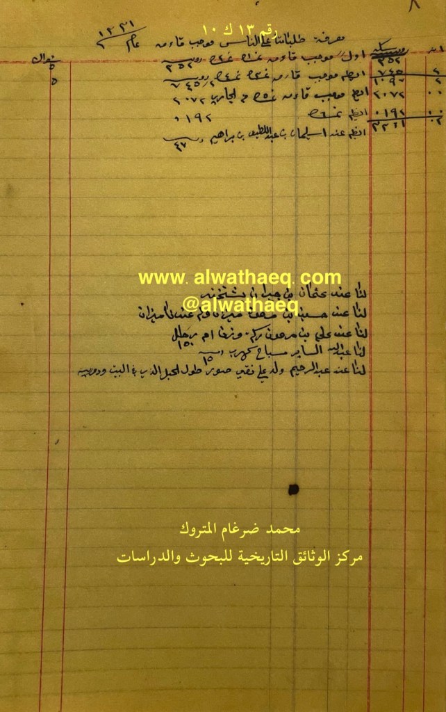 كشف حساب سنة ١٩١٣ م من دفاتر التاجر محمد بن عبدالله المتروك الاسماء التي ذكرت🚩: سليمان بن عبداللطيف بن ابراهيم / عثمان بن جيران / حسين بن مرهون / علي بن مرهون / عبدالله الساير / عبدالرحيم ولد علي نقي الاماكن التي ذكرت🚩: البيت من البضائع والمعاملات التي ذكرت 🚩: بشتخته / ميزان / ركه وزن ان ١٥٠ رطل / مسباح كهرب / صور طول الحبل الذي في البيت ودوريه العملات المتداولة🚩: انه / ربيه سكه وثيقة رقم ( ١٣ ك ١٠ )🚩: . ✏️شرح وتعليق / محمد ضرغام المتروك . الوثائق التاريخية للبحوث والدراسات