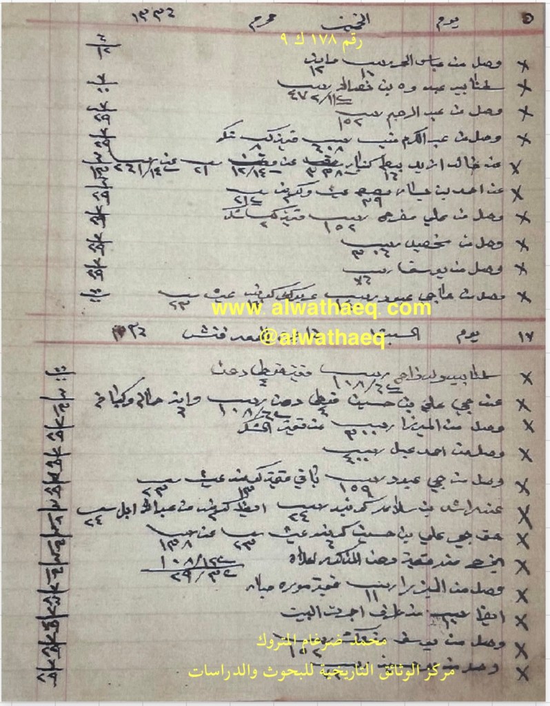 كشف حساب سنة ١٩١٧ م من دفاتر التاجر محمد بن عبدالله المتروك الاسماء التي ذكرت🚩: عباس الحمر / عبدوه بن نصرالله / عبدالرحيم / عبدالكريم / خالد الزيد / احمد بن يسار ( جسار ) / علي مفرج / مخصيد ( مقصيد ) / يوسف / حاجي عبود / ولد فراج / حجي علي بن حسين / الميرزا / احمد عبل / راشد بن سلامه / عبدالله ابل / يوسف متروك / بوحسين الاماكن التي ذكرت🚩: البيت من البضائع والمعاملات التي ذكرت 🚩: شكر / ١٦ بيطه كنبار / ٣٩ نصيفه عيش / ١٤٠ ربيه عربون ١٣ كونيه عيش / دهن / صبار / ١٠ ربيه من طرف اجرت البيت / استلام مبالغ نقدية العملات المتداولة🚩: ربيه / انه وثيقة رقم ( ١٧٨ ك ٩ )🚩: . ✏️شرح وتعليق / محمد ضرغام المتروك . الوثائق التاريخية للبحوث والدراسات