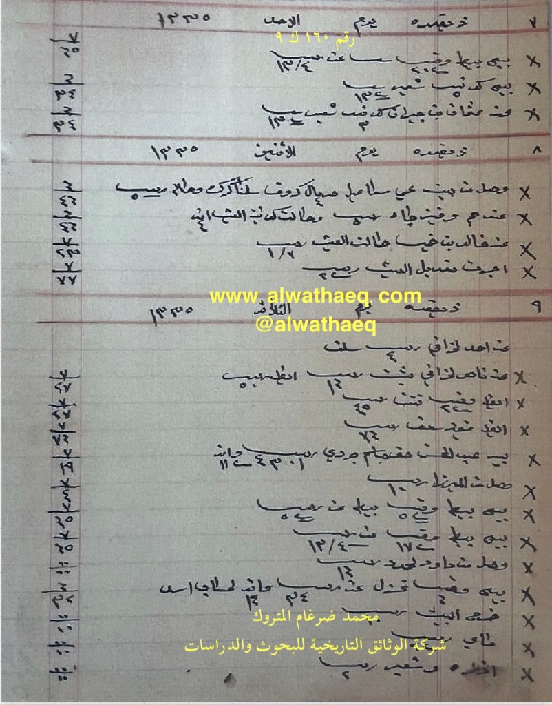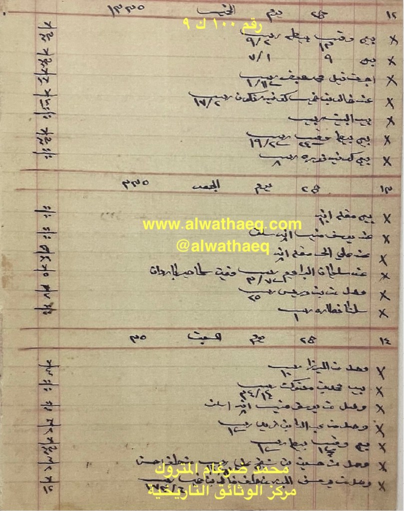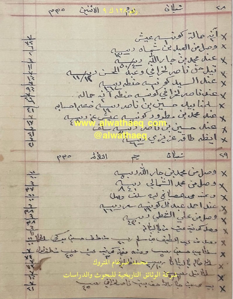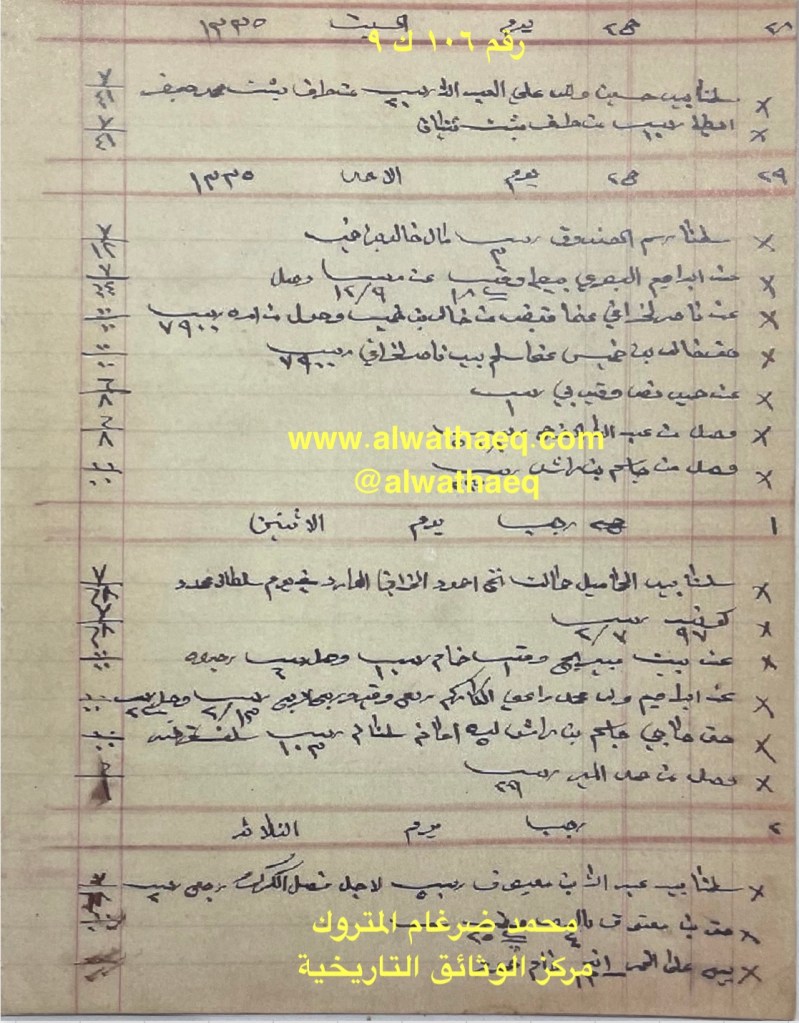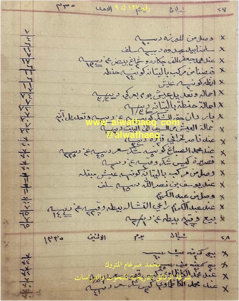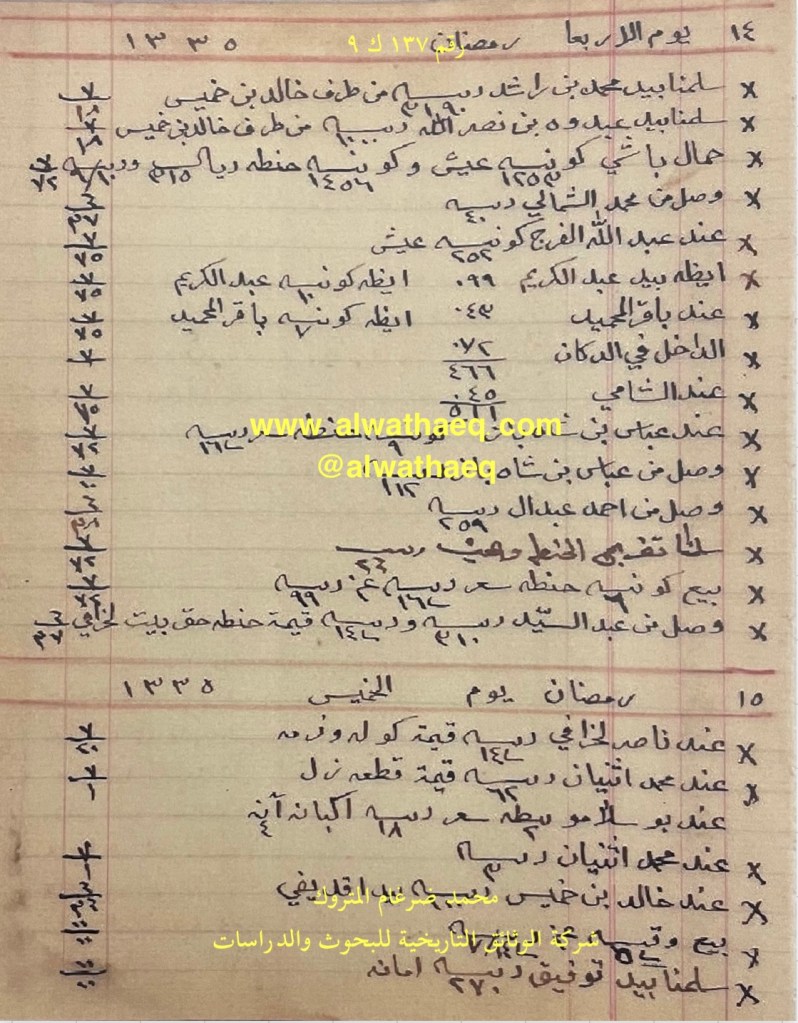 كشف حساب سنة ١٩١٧ م من دفاتر التاجر محمد بن عبدالله المتروك الاسماء التي ذكرت🚩: محمد بن راشد / خالد بن خميس / عبدوه بن نصرالله / محمد الشمالي / عبدالله الفرج / عبدالكريم / باقر المحميد / الشامي / عباس بن شاه باز / احمد عبدال / عبدالسيد / ناصر الخرافي / محمد ثنيان / بوسلامو / القديفي / توفيق الاماكن التي ذكرت🚩: الدكان / بيت الخرافي من البضائع والمعاملات التي ذكرت 🚩: سلمنا بيد محمد بن راشد ٣١٩٠ ربيه و بيد عبدوه بن نصرالله ١٠٠٠ ربيه من طرف خالد بن خميس / حمال باشي ١٢٥٣ كونيه عيش و ١٤٥٦ كونيه حنطه ٣١٥ ريال / عند عبدالله الفرج ٢٥٢ كونيه عيش / ٥١١ كونيه عيش / كوله و زمه / قطعة زل / بيطه / ٢٧٠ ربيه امانه العملات المتداولة🚩: ربيه / ريال / آنه وثيقة رقم ( ١٣٧ ك ٩ )🚩: . ✏️شرح وتعليق / محمد ضرغام المتروك