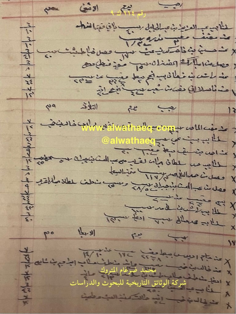 كشف حساب سنة ١٩١٧ م من دفاتر التاجر محمد بن عبدالله المتروك الاسماء التي ذكرت🚩: عبدالعزيز بن عبدالجليل / مضف / حسين بن ناصر / مبارك الفوزان / راشد بن فرحان / نجم / ناصر الخرافي / فهد الماص / حامد (غيص) الغرير / خالد بن خميس / احمد بن سيف / حمد سلطان ( بحار ) الغرير / عبدالمحسن بن جيران / حمد اليلاهمه ( الجلاهمه ) / راشد بن سلامه / محمد صالح / جاسم الدبوس / ابراهيم بن شايع / عبدالحسين من البضائع والمعاملات التي ذكرت 🚩: ٤٠ ربيه باقي قيمة الانواط / ٣ وقيه نوره / كونيه عيش / خياط بشت / قوطي ودچ / بيطه / طحين العملات المتداولة🚩: ربيه / انه وثيقة رقم ( ١١٤ ك ٩ )🚩: . ✏️شرح وتعليق / محمد ضرغام المتروك