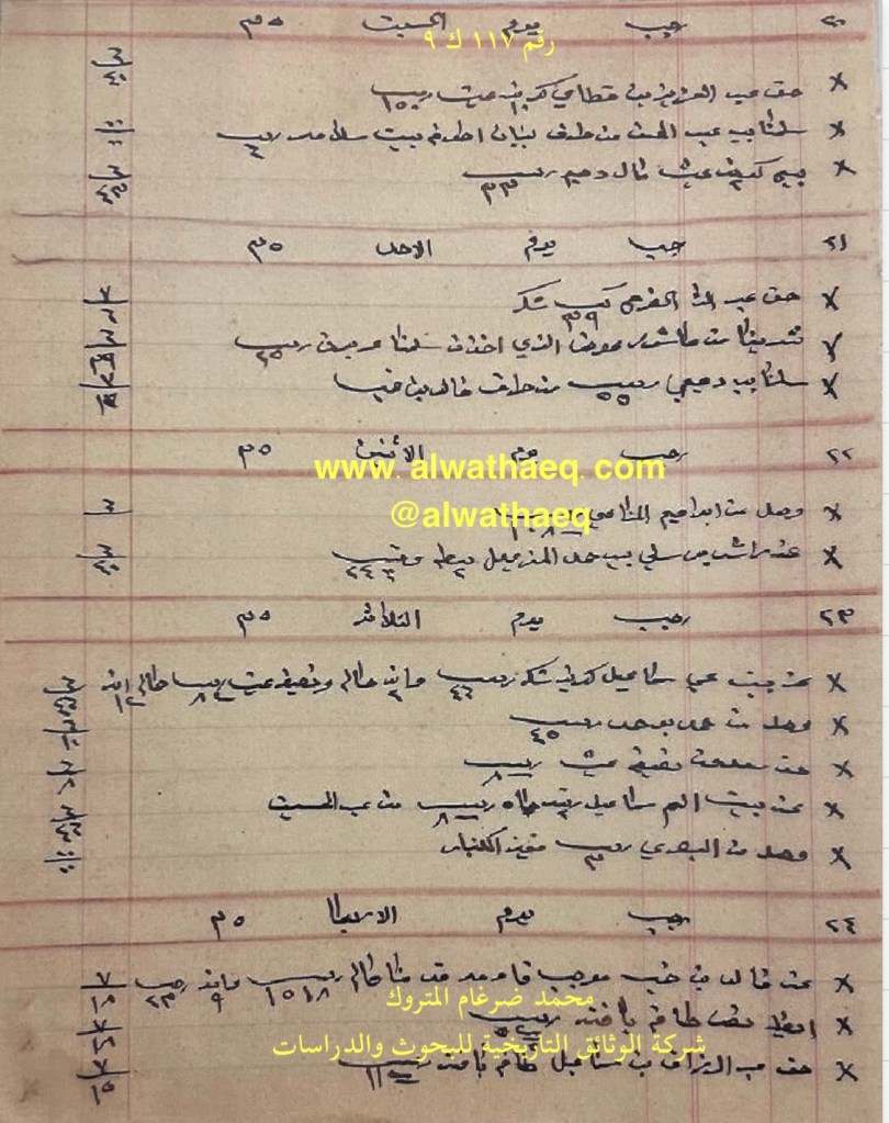 كشف حساب سنة ١٩١٧ م من دفاتر التاجر محمد بن عبدالله المتروك الاسماء التي ذكرت🚩: رجب / عبدالله الساير / خالد بن خميس / احمد الفلاح / صقر العطيبي / عبدالمحسن بن جيران / عبدالله بن زايد / جاسم بن راشد / حسين ولد عمي ( المحميد ) / حميد / حميد ولد بومجيد / الميرزا / عبدالرزاق بن علي اسماعيل / يوسف منيس / صالح السنين / محمد عبدالرزاق بن نصرالله / طاهر بن حجي / حاجي سليم / حمود البرغش / حميزه / حسين بن شيخ علي ( اليوسف ) / علوه الشمالي / جاسم بن محمد الاماكن التي ذكرت🚩: البيت من البضائع والمعاملات التي ذكرت 🚩: كنبار / بي / حواله ٣٠٠٠ ربيه / النور / بيطه / ٥ ليره امانه / حصتنا من البلم وقيمة البيت / ٣٠٠ ربيه سلف / ٨٠٠ ربيه امانه / تراز السفن التي ذكرت🚩: بلم العملات المتداولة🚩: ربيه / ليره / ريال وثيقة رقم ( ١٠٨ ك ٩ )🚩: . ✏️شرح وتعليق / محمد ضرغام المتروك