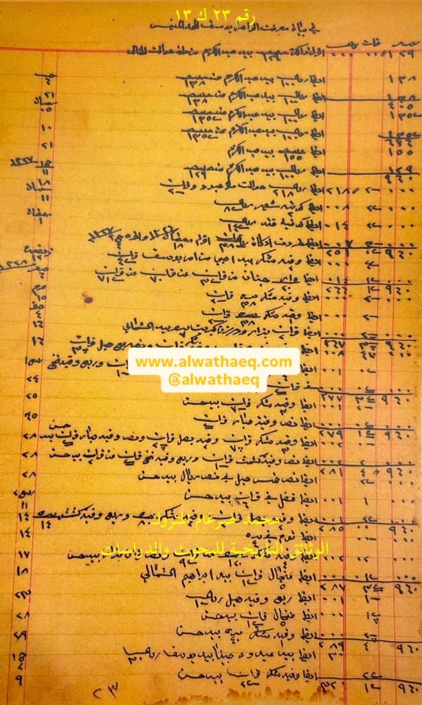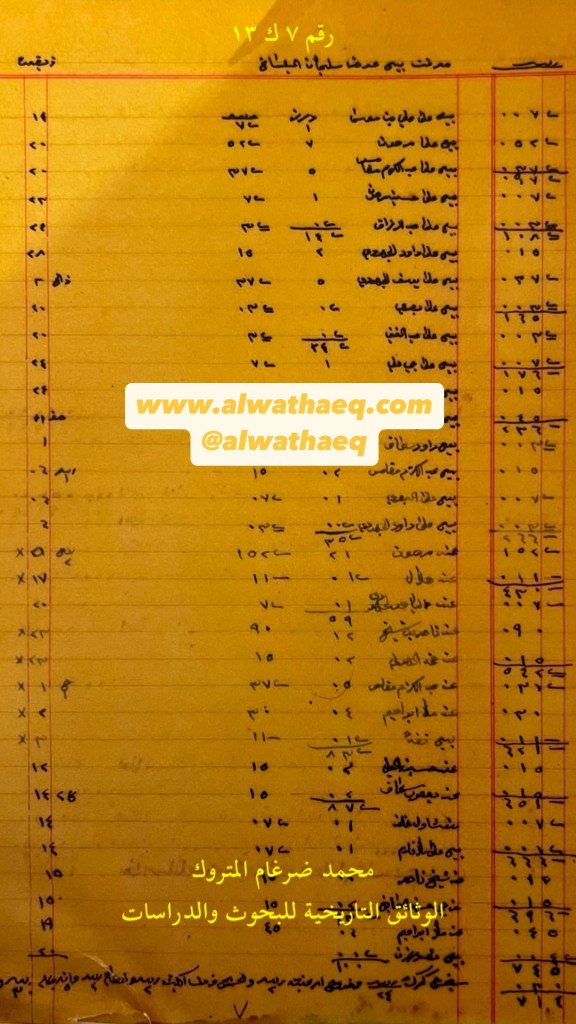 كشف حساب سنة ١٣٢٦هـ – ١٩٠٨م من دفاتر التاجر محمد بن عبدالله المتروك الاسماء التي ذكرت🚩: سليمان ( الابراهيم ) / علي بن موسى / مرهون / عبدالكريم مقامس / حسين مرهون / عبدالرزاق / داود الجهودي ( اليهودي ) / يوسف الجهودي ( اليهودي ) / بصري / عبدالمغني / حجي علي / داود اسحاق / البصري / داود الجهودي / هلال / إلياهو الجهودي / ناصر بن شيخ / محمد الهولي / ملا إبراهيم / حسين العلي / يعقوب اسحاق / شاول خلف / ملا غلام / الشيخ ناصر ( الصباح ) / حجي حسين الصايغ / ملا ابراهيم من البضائع والمعاملات التي ذكرت 🚩: ١٠٠ درزن شماغ / فردة الكيش العملات المتداولة🚩: ربيه / آنه وثيقة رقم ( ٧ ك ١٣ )🚩: . ✏️شرح وتعليق / محمد ضرغام المتروك . الوثائق التاريخية للبحوث والدراسات