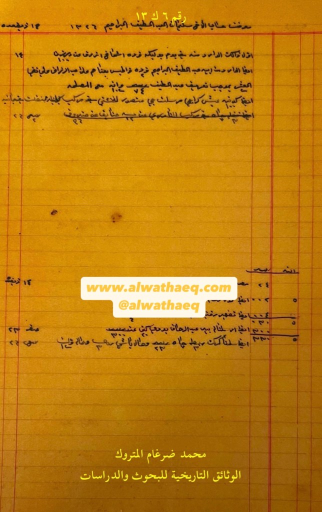 كشف حساب سنة ١٣٢٦هـ – ١٩٠٨م من دفاتر التاجر محمد بن عبدالله المتروك