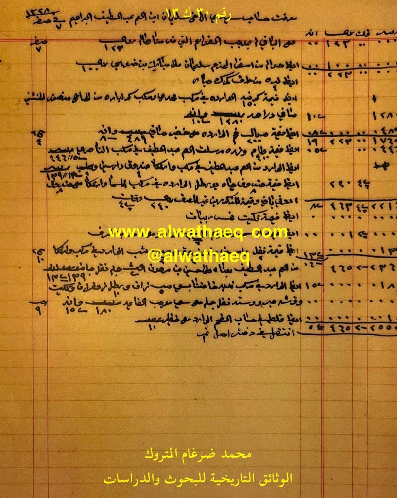 كشف حساب سنة ١٣٢٨هـ – ١٩١٠م من دفاتر التاجر محمد بن عبدالله المتروك الاسماء التي ذكرت🚩: سليمان بن عبداللطيف الابراهيم / مبارك بن ضويحي / الحاج منصور الخشتي / خضير / العم عبداللطيف ( الابراهيم ) / ناصر بن شرف / حسين بن مرهون