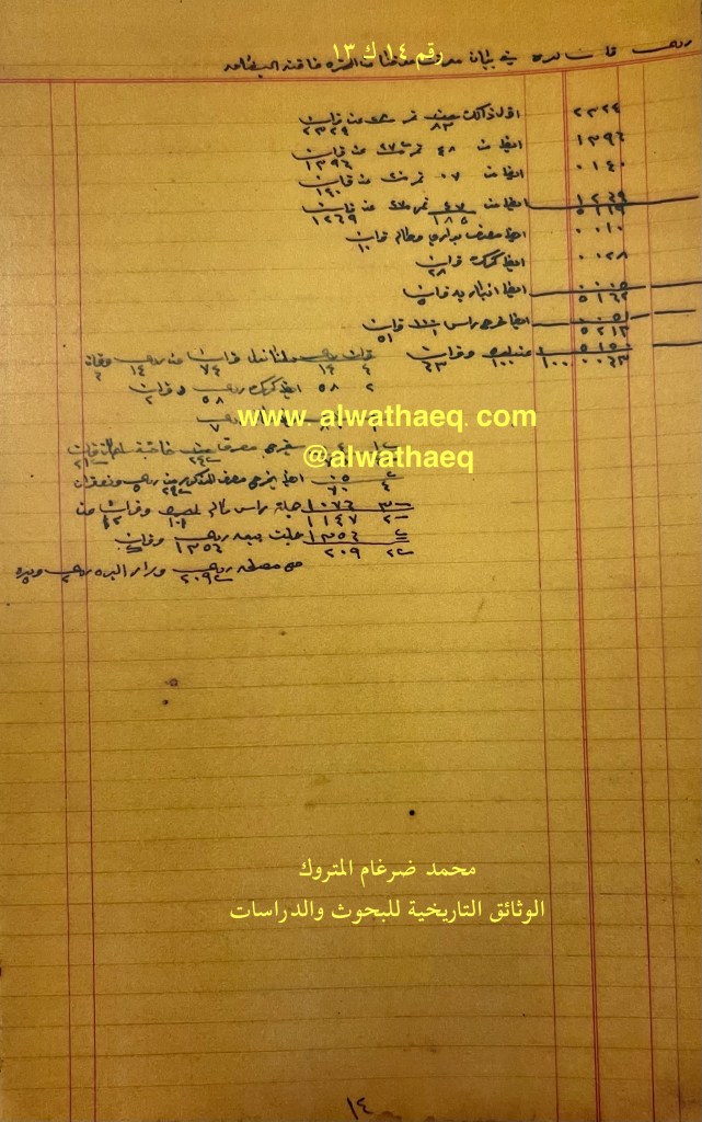 كشف حساب سنة ١٣٢٨هـ – ١٩١٠م من دفاتر التاجر محمد بن عبدالله المتروك الاسماء التي ذكرت🚩: حاجي منصور بن خميس الخشتي / عبدالرحمن بن حسين العسعوسي / محمد ثنيان / سليمان الذكير / سليمان العبداللطيف الابراهيم