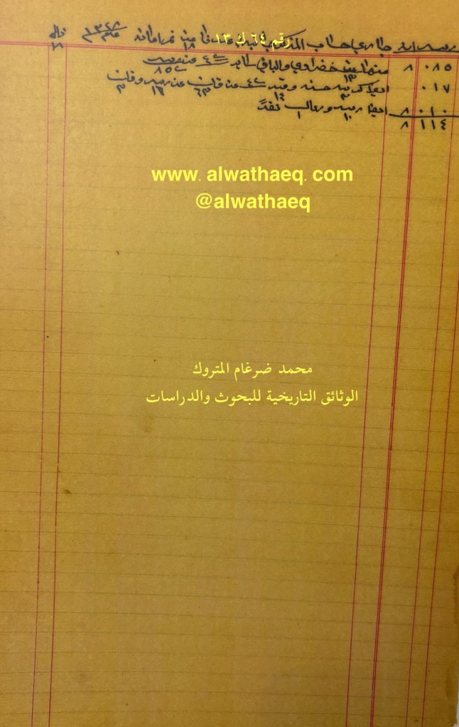 كشف حساب سنة ١٣٢٨هـ – ١٩١٠م من دفاتر التاجر محمد بن عبدالله المتروك الاسماء التي ذكرت🚩: جاسم بن محمد بودي / محمد بن علي الشتيوي / حجي سلمان / سليمان الذكير / الدوسلاني / محمد البرغش / جاسم بن احمد الماجد