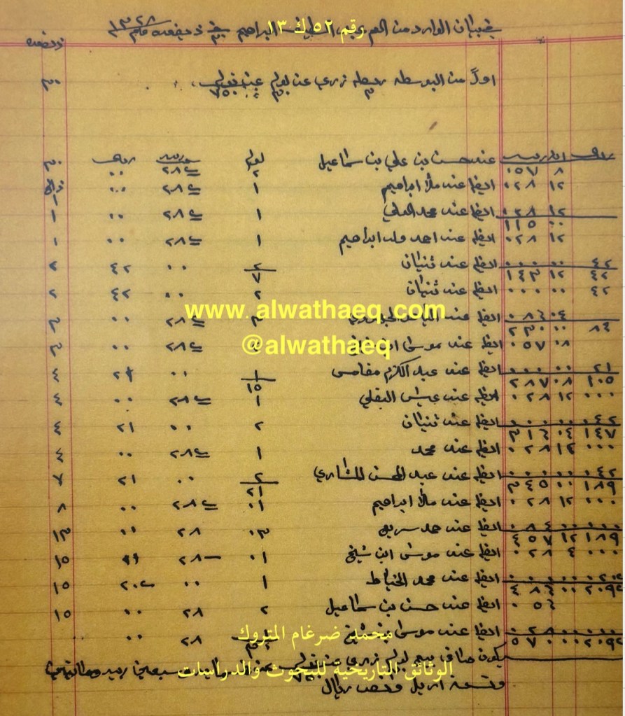 كشف حساب سنة ١٣٢٨هـ – ١٩١٠م من دفاتر التاجر محمد بن عبدالله المتروك الاسماء التي ذكرت🚩: عبداللطيف الابراهيم / حسن بن علي بن إسماعيل / ملا ابراهيم / محمد العلي / احمد ولد ابراهيم / ثنيان / الياهو الجهودي ( اليهودي ) / موسى ابن شيخ / عبدالكريم مقامس / عيسى البغلي / محمد / عبدالمحسن المشاري / حمد سريع / محمد الخياط / حسن بن إسماعيل من البضائع التي ذكرت 🚩: اولاً البوسطه ٣ ربطه زري عن ٣٠ لوله عن ٧٥٠ توله العملات المتداولة🚩: ربيه / آنه / ريال مضمون الرسالة🚩: معاملات تجارية في المواد الاستهلاكية وثيقة رقم ( ٥٢ ك ١٣ )🚩: . ✏️شرح وتعليق / محمد ضرغام المتروك . الوثائق التاريخية للبحوث والدراسات