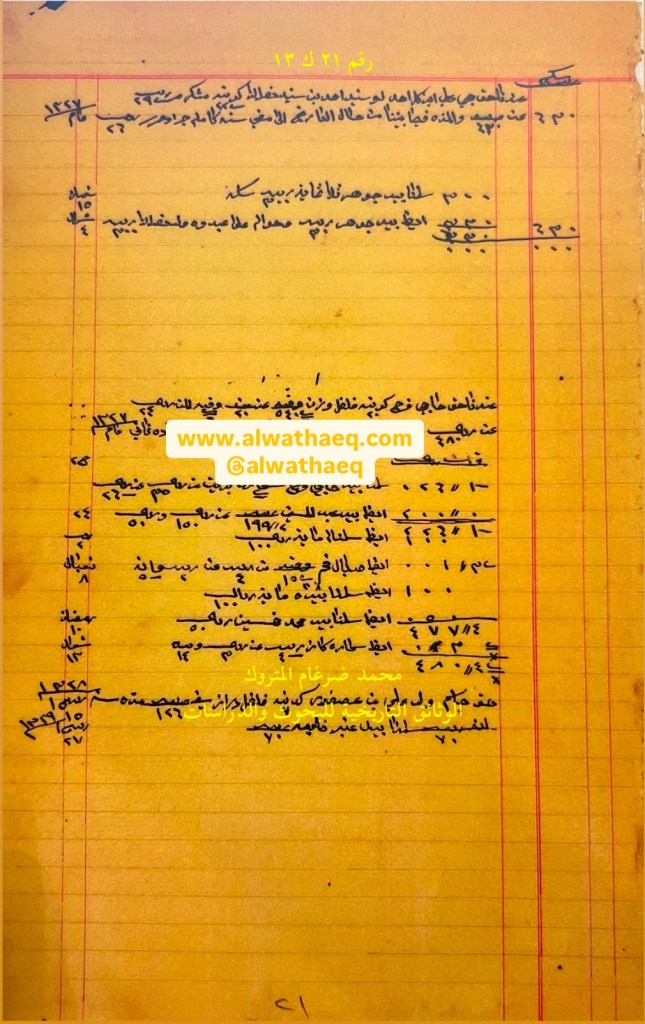 من البضائع والمعاملات التي ذكرت 🚩: ٤٠ ليره امانه نشتري له بسعي / نخج ( كونيه ) / گواني / خيوط / بيذان ( كونيه ) / جواز / دهن ( قوطي ) / شماغ ( درزن ) / ١٥ وصله شيله سوده عن ١٠٤٩ وار عن طول ٨٧ / ٥ وصله طري ابيض عن ٢٥٣ وار عن ٢١ طول / سعي / قصيرة الشيله ١٧ وار عن ١ طول / زهور ( كورجه ) / كريشه / شعير ( كونيه )