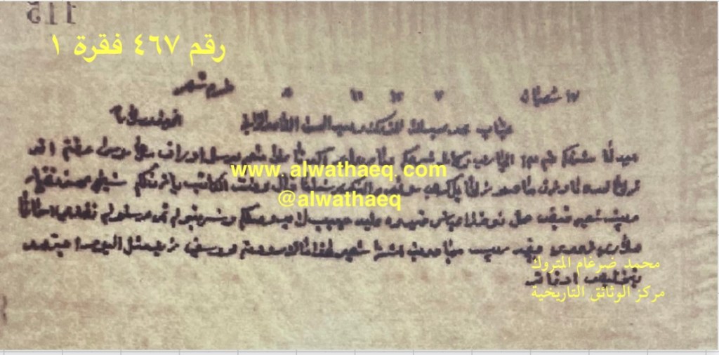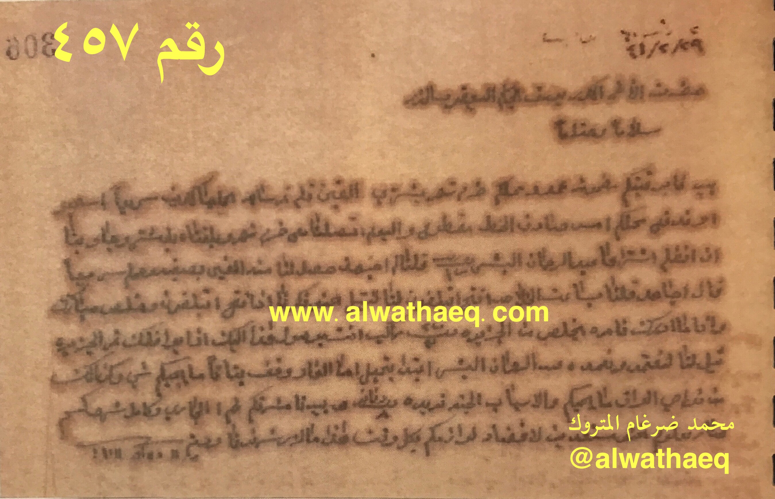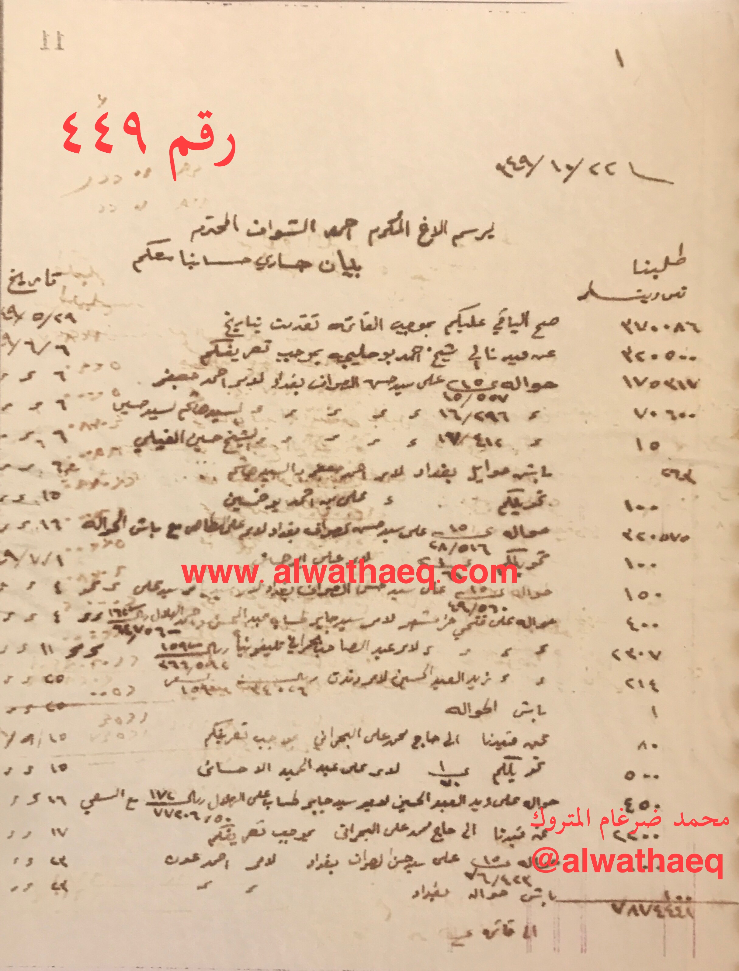 رسالة سنة ١٩٤٤ م من محمد بن عبدالله المتروك الى محمد العبدالله العريفي ( بغداد ) الاماكن التي ذكرت🚩: بغداد / خرم شهر / سوريا / ايران / الاسواق من المعاملات والبضائع التي ذكرت 🚩: چاه / بضائع حراير مضمون الرسالة🚩: معاملات تجارية في المواد الغذائية والاستهلاكية ومنها الحاج محمد المتروك يبلغ العريفي انه تم اسلام الچاه وجاري قبض باقي قيمته كذلك يبلغه ان له بضاعة متجه الى ايران فاذا له بضاعة متجه الى خرم شهر ( المحمره ) ياخذه شراكة معه وهو يسعى به في خرم شهر ثم يستقر منه ( الحراير ) وارده من سوريا ويطلب منه الافاده وثيقة رقم( ٤٧٩ فقرة ٣ )🚩: . ✏️شرح وتعليق / محمد ضرغام المتروك . الوثائق التاريخية للبحوث والدراسات