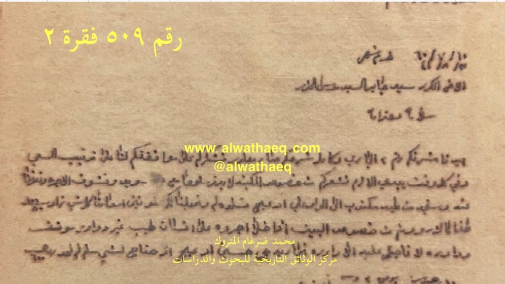 مضمون الرسالة🚩: الحاج محمد المتروك يشكر سيد جابر على ترتيب السعي ويتاكد منه ان تم تسليم المكينه مع علي سويد كذلك يبلغ ان اسعار السلع بازدياد ، وان يوجد رساله يجب ان يسلمها الى الولد علي الدعيج كذلك يوصيه بان يؤجر البيت ( احد بيوت الحاج محمد المتروك في خرمشهر (المحمره) ) على انسان طيب او على دائرة تجارية ويختم في الرسالة حجي حسين الدعيج اذا احتاج شي سلم له الى حد ٦٠٠ ريال . وثيقة رقم( ٥٠٩ فقرة ٢)🚩: . ✏️شرح وتعليق / محمد ضرغام المتروك . الوثائق التاريخية للبحوث والدراسات
