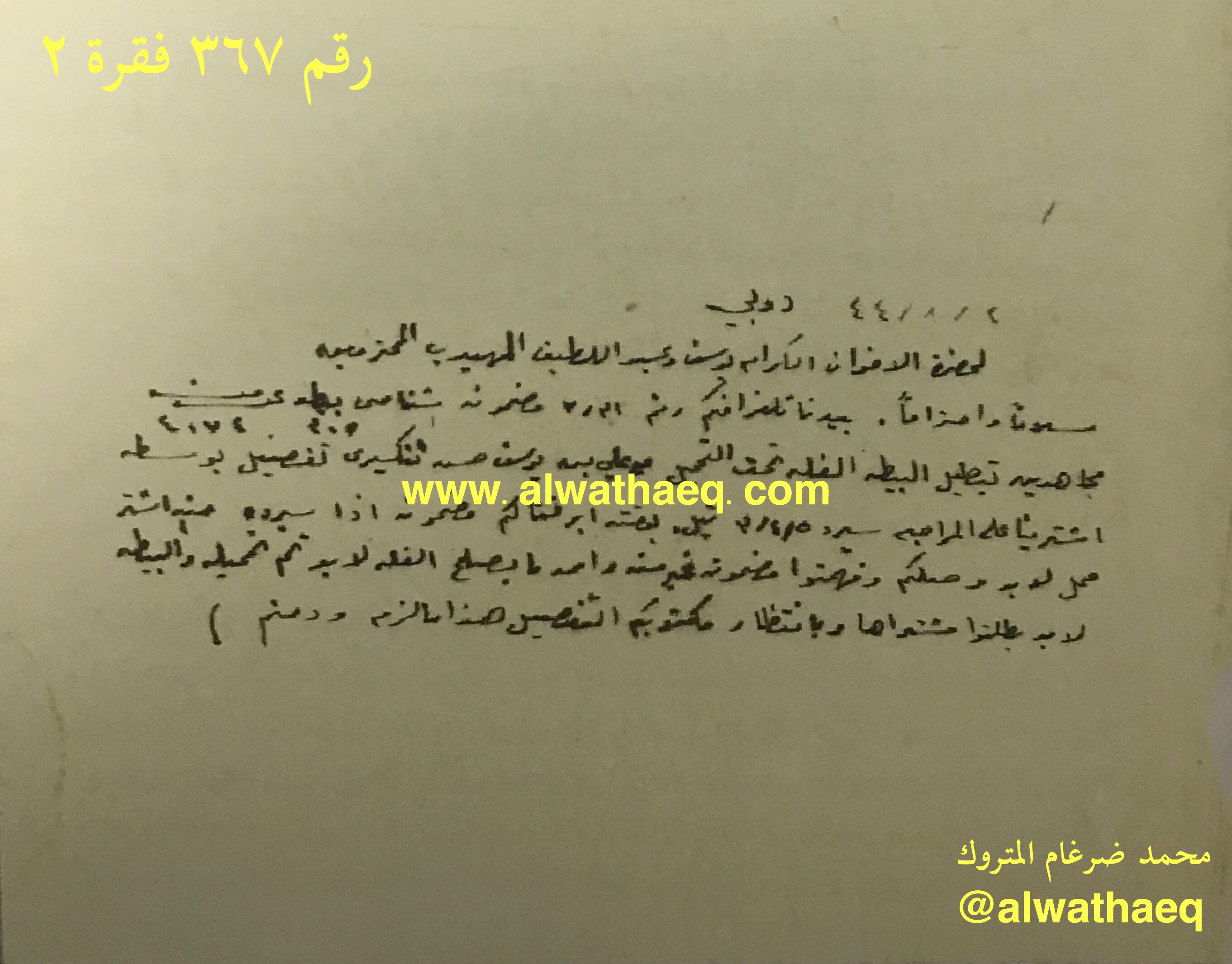 رسالة سنة ١٩٣٥ م من محمد عبدالله المتروك وعبدالمحسن الخرافي (توقيع) محمد المتروك الى علي بن عيسى ( الجمعه ) (الكويت) . الاسماء التي ذكرت🚩: الكاتب حبيب . الاماكن التي ذكرت🚩: الكويت / البحرين / دبي / الحفيز / المحل . البضائع والمعاملات التي ذكرت🚩: طحين / ١٥٠ كيس طحين / غزل / تمر ساير / تمر دروقي . السفن التي ذكرت🚩: الخشب . مضمون الرسالة🚩: التجارة بين الكويت والبحرين ودبي ومنها الحاج محمد المتروك يحمل ١٥٠ كيس طحين الى دبي ويبلغ الحاج علي الجمعه ان يسلم الحفيز الى الكاتب حبيب ويسافر الى البحرين ويفتح محل من اجل تحميل الغزل ويحمل البضائع من الكويت الى البحرين حيث ان الكويت في ذلك الوقت البيع فيها ضعيف ومن جملة ما قال ( الكويت في الوقت الحاضر ما فيها منافع ربما انه يحصل نصيب في البحرين ) . وثيقة رقم( ٤٦٥ فقرة ٢ )🚩: . ✏️شرح وتعليق / محمد ضرغام المتروك