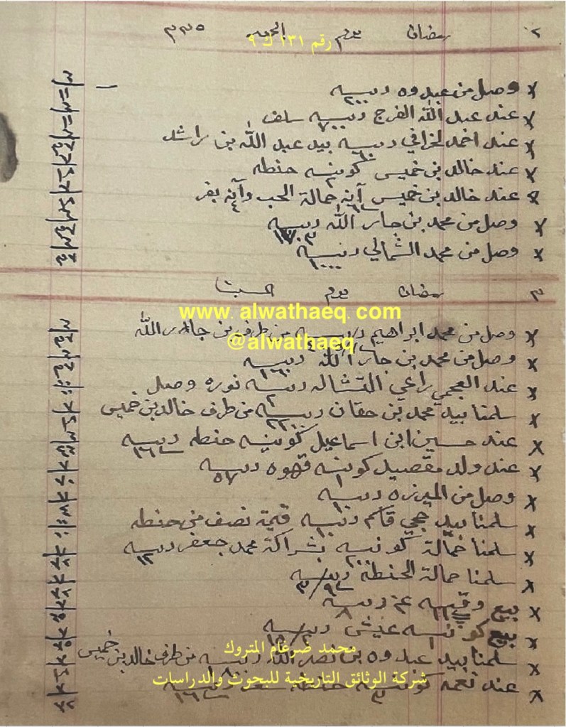 كشف حساب سنة ١٩١٧ م من دفاتر التاجر محمد بن عبدالله المتروك الاسماء التي ذكرت🚩: عبدوه / عبدالله الفرج / احمد الخرافي / عبدالله بن راشد / خالد بن خميس / محمد بن جارالله / محمد الشمالي / محمد ابراهيم / العجمي راعي التشاله / محمد بن حقان / حسين بن اسماعيل / ولد مقصيد / الميرزه / حجي قاسم / محمد جعفر ( الكعبي ) عبدوه بن نصرالله / نعمه من البضائع والمعاملات التي ذكرت 🚩: ٧٠٠ ربيه سلف / حنطه / حمالة الحب / وصل من محمد بن جارالله ١٧٠٣ ربيه / وصل من محمد الشمالي ١٠٠٠ ربيه / نوره / سلمنا محمد بن حقان ٢٢٠٠ ربيه من طرف خالد بن خميس / قهوه / سلمنا حمالة ٢٠٠ كونيه بشراكة محمد جعفر / عيش / سلمنا بيد عبدوه بن نصرالله ١٨٠٠ ربيه من طرف خالد بن خميس السفن التي ذكرت🚩: تشاله العملات المتداولة🚩: ربيه / انه وثيقة رقم ( ١٣١ ك ٩ )🚩: . ✏️شرح وتعليق / محمد ضرغام المتروك