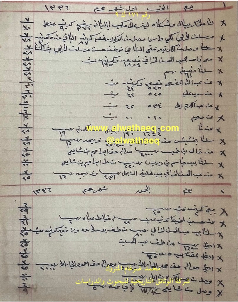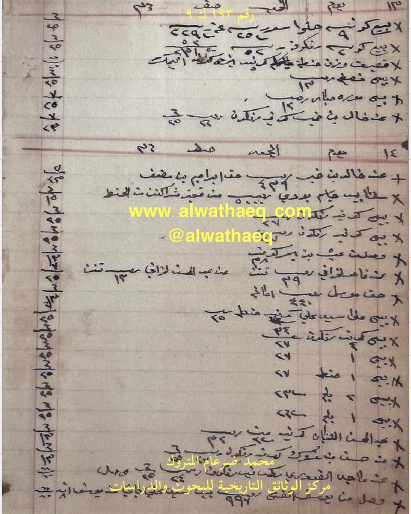 كشف حساب سنة ١٩١٧ م من دفاتر التاجر محمد بن عبدالله المتروك الاسماء التي ذكرت🚩: خالد بن خميس / ابراهيم بن مضف / جاسم بودي / بن بحر / ناصر الخرافي / عبدالمحسن الخرافي / موسى / سيد علي / عبدالمحسن الثنيان / حسن بن متروك / ماجد الفودري / يوسف الفرج من البضائع والمعاملات التي ذكرت 🚩: ٩ كونيه حلوا / رنكون / حنطه / صبار / سلمنا بيد جاسم بودي ٥٠٠٠ ربيه من قيمة شراكة الحنطه / ٣٨ كونيه عيش (شراكة التاجرين محمد المتروك وجاسم بودي ) / ٤٤٠ ربيه امانه / ١٢ كونيه حنطه / بلم / وصل من يوسف الفرج ٩٩٧ ربيه بيد سيد علي ( الزلزله ) باقي عند يوسف ٨ انه السفن التي ذكرت🚩: انيمك العملات المتداولة🚩: ربيه / انه وثيقة رقم ( ١٩٣ ك ٩ )🚩: . ✏️شرح وتعليق / محمد ضرغام المتروك . الوثائق التاريخية للبحوث والدراسات