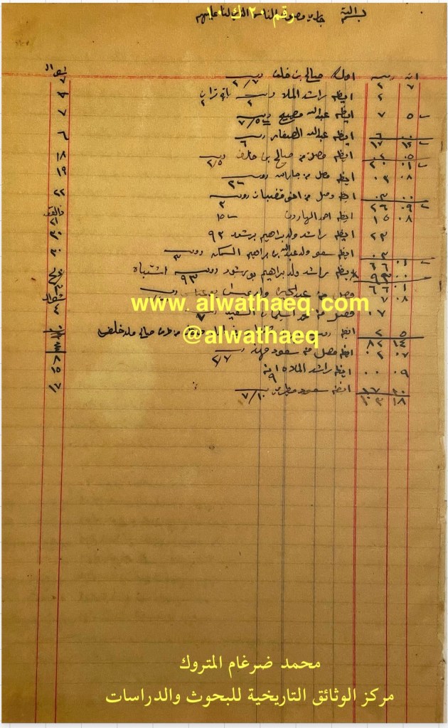 كشف حساب سنة ١٩١٣ م من دفاتر التاجر محمد بن عبدالله المتروك الاسماء التي ذكرت🚩: عويد بوصويحب / بوعبود / بطي / عباس خرشان / ولد مبيلش / سعود مبيريچ / حسين الحدب / عبدالله جمعه / ناصر المعيلي / سيد هاشم ولد سيد سليمان سليمون / اسماعيل بن الشيخ / كركري ولد حسين النغيمش / عبدالرسول ولد عيدي / ناصر اليعقوب / محمود القطان / بلال الحساوي / جاسم الحداد / صالح ولد چحيل ( الجحيل ) / مرزوق عبد ناهض / شيخ يابر ( جابر ) الصباح / بشير عبد محمد حسين / حجي علي البصري / متروك ولد مكي ( المتروك ) / محمد لاري / العم اسماعيل ( المحميد ) / احمد المحسن / عباس غلوم في القصبه / لحدان / عبدالرحمن العسعوسي / طلبه نوخذه بلم الشيوخ / رجب الحمالي / عبدالله العلي القطان / محمد الاربش الاماكن التي ذكرت🚩: القصبه من البضائع والمعاملات التي ذكرت 🚩: استلام مبالغ نقدية السفن التي ذكرت🚩: بلم الشيوخ العملات المتداولة🚩: ربيه / انه وثيقة رقم ( ٢١ ك ١٠ )🚩: . ✏️شرح وتعليق / محمد ضرغام المتروك . الوثائق التاريخية للبحوث والدراسات